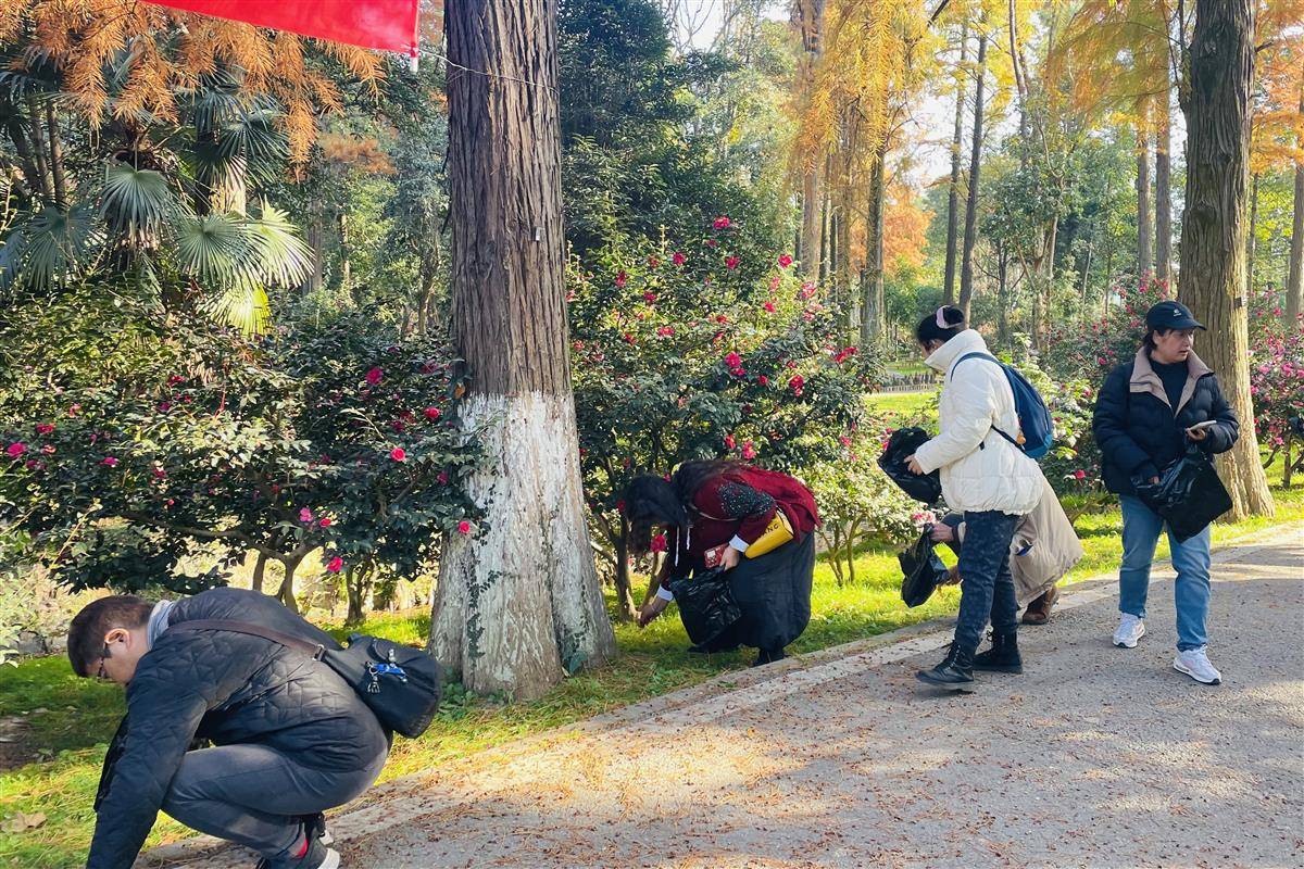 活动中,武汉植物园工程师陈长丽带领市民沿园讲解各类植物的生态价值。此时的武汉植物园正迎来一场热烈的“色彩交响”。园内杉树、悬铃木、银杏、枫香、槭树等变色树种纷纷披上“彩装”,以斑斓姿态点亮冬日视野。市民在园中一同俯身捡拾散落垃圾,还原自然原有的洁净面貌。