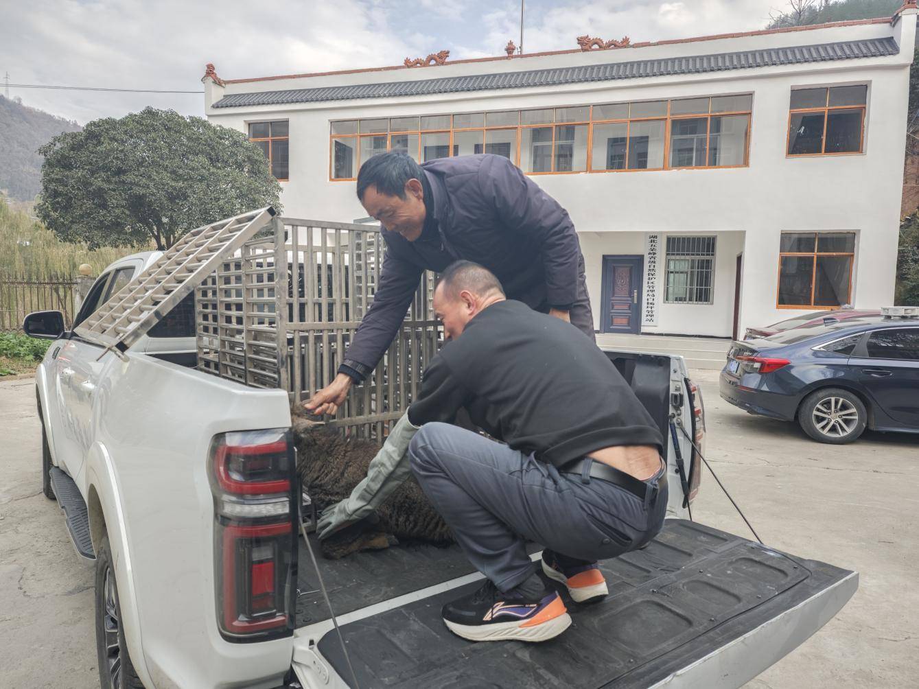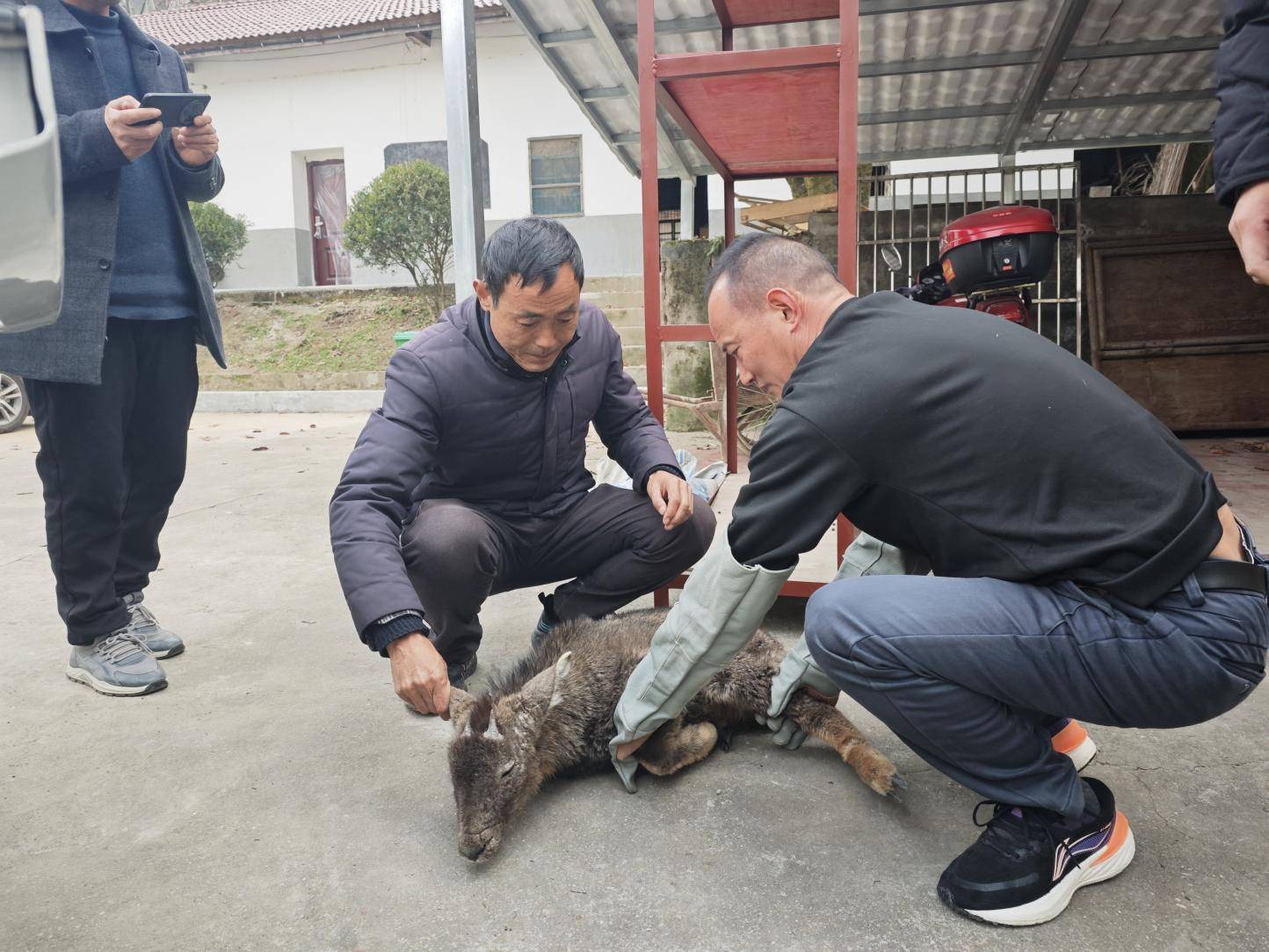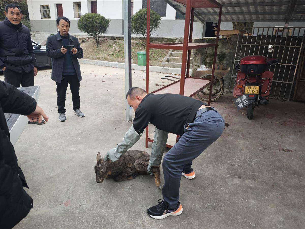 40分钟后,丹江口市林业局野保站技术团队带着急救箱、担架等设备赶到现场。经检查,这是一只成年中华斑羚,体长约0.8米,体重约15公斤,腿部受伤无法正常行走。为确保救助科学有效,工作人员先用软布包裹斑羚避免二次伤害,小心抬上专用运输笼,送往野保站临时救护点进一步观察。