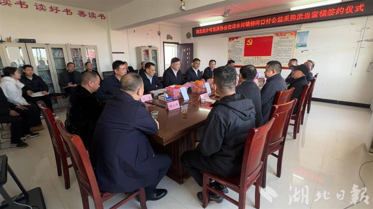 11月25日,湖北省乡村发展协会相关负责人率队到丹江口市凉水河镇柳河口村,开展公益采购“武当蜜桔”活动。采购签约仪式上,湖北清能川江产业园投资有限公司、中建三局云能环境投资有限公司等企业代表,与柳河口村果农代表签署首批“武当蜜桔”采购协议,该批蜜桔将定向捐赠给武汉环卫工人。