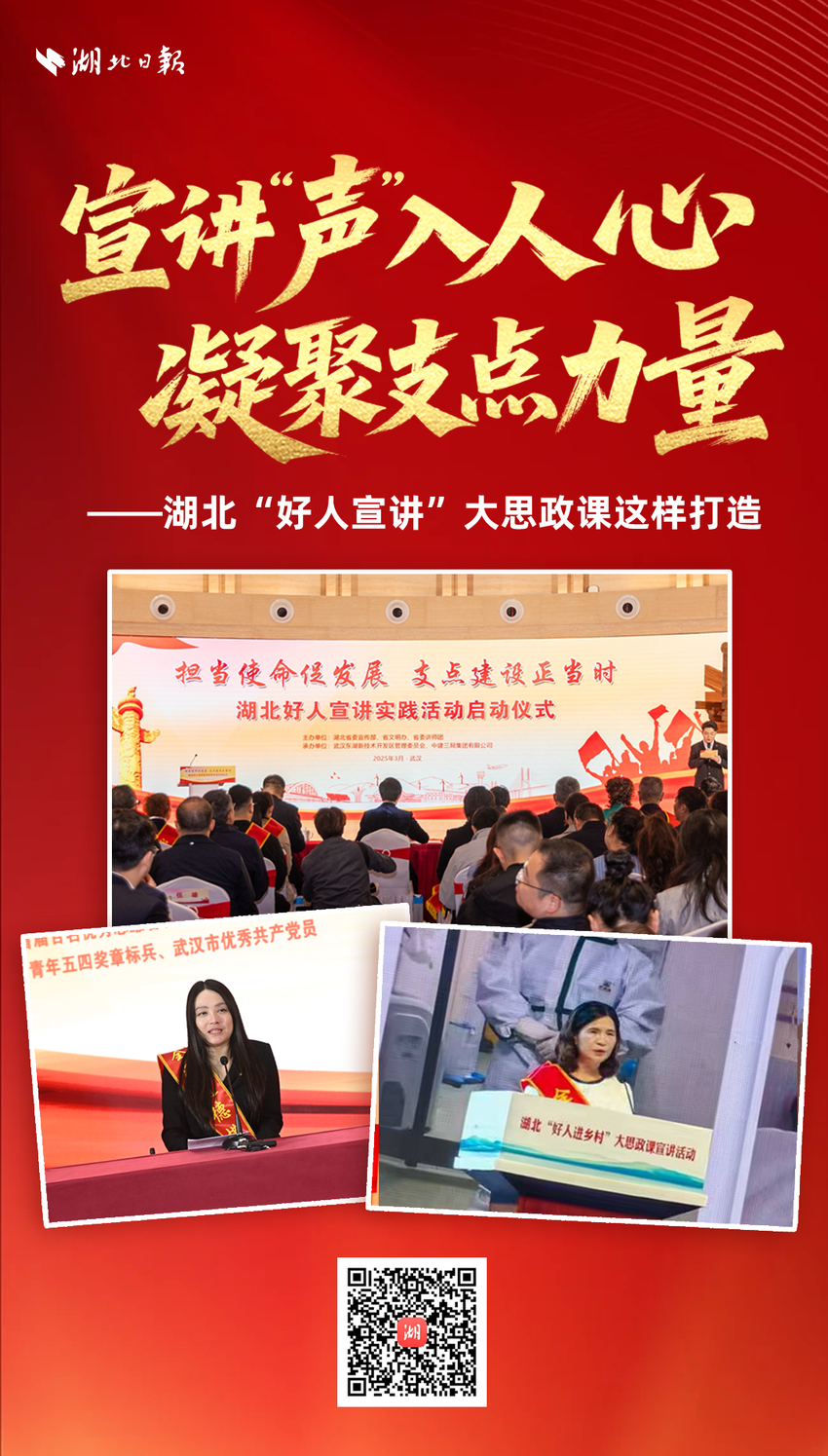 湖北“好人宣讲”大思政课活动坚持围绕宣传主题主线,聚焦阶段性宣传宣讲重点,把思政课搬到群众身边,以小故事讲大道理,身边事教育身边人,让主流价值在情感共鸣中自然扎根。聚焦学习宣传贯彻党的二十届四中全会精神,4名中国好人分别以《铁骨铸忠诚 实干映初心》《做党和人民的勇士》《以阅读为炬 点亮文明之光》《真情告白》为题,引导干部群众在学习好人感人事迹中砥砺初心使命,将精神力量转化为实干动能。