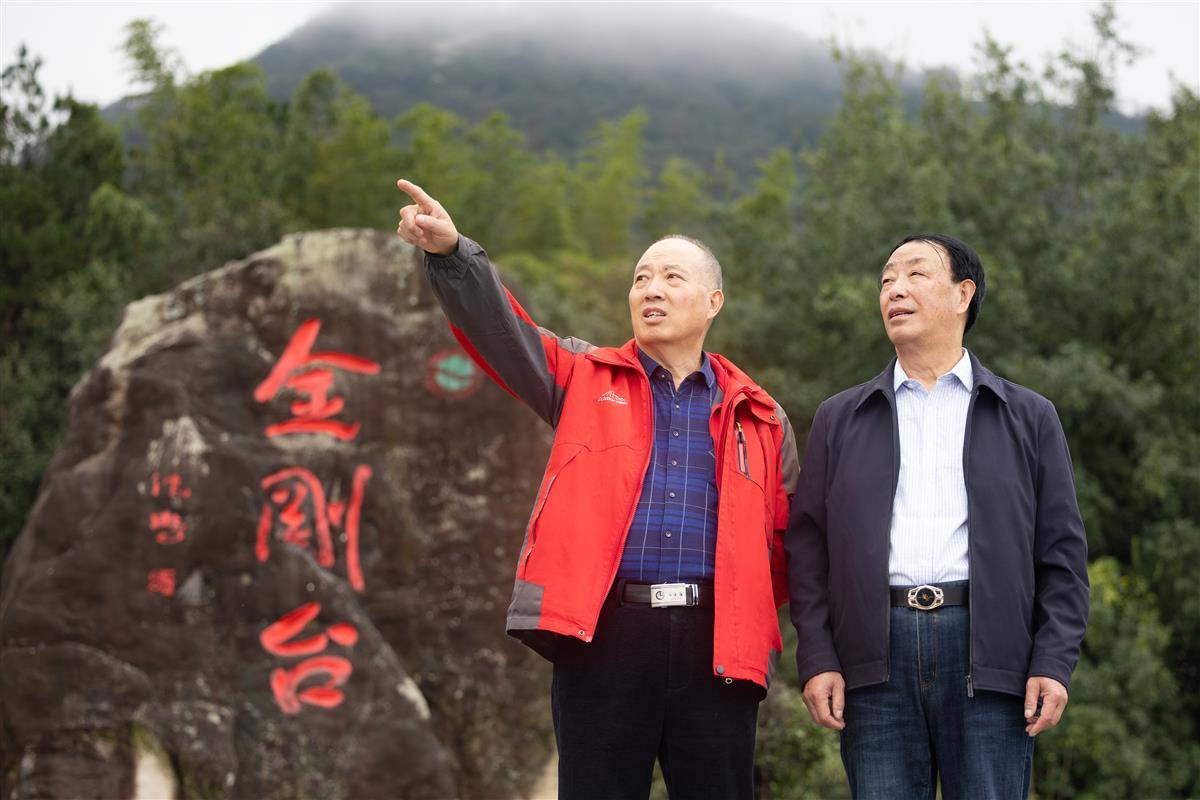 2025年10月17日,金刚台下,张敏的孙子曾祥有(右)、曾祥海远眺她曾经战斗生活过的大别山深处。(湖北日报全媒记者 何宇欣 摄)