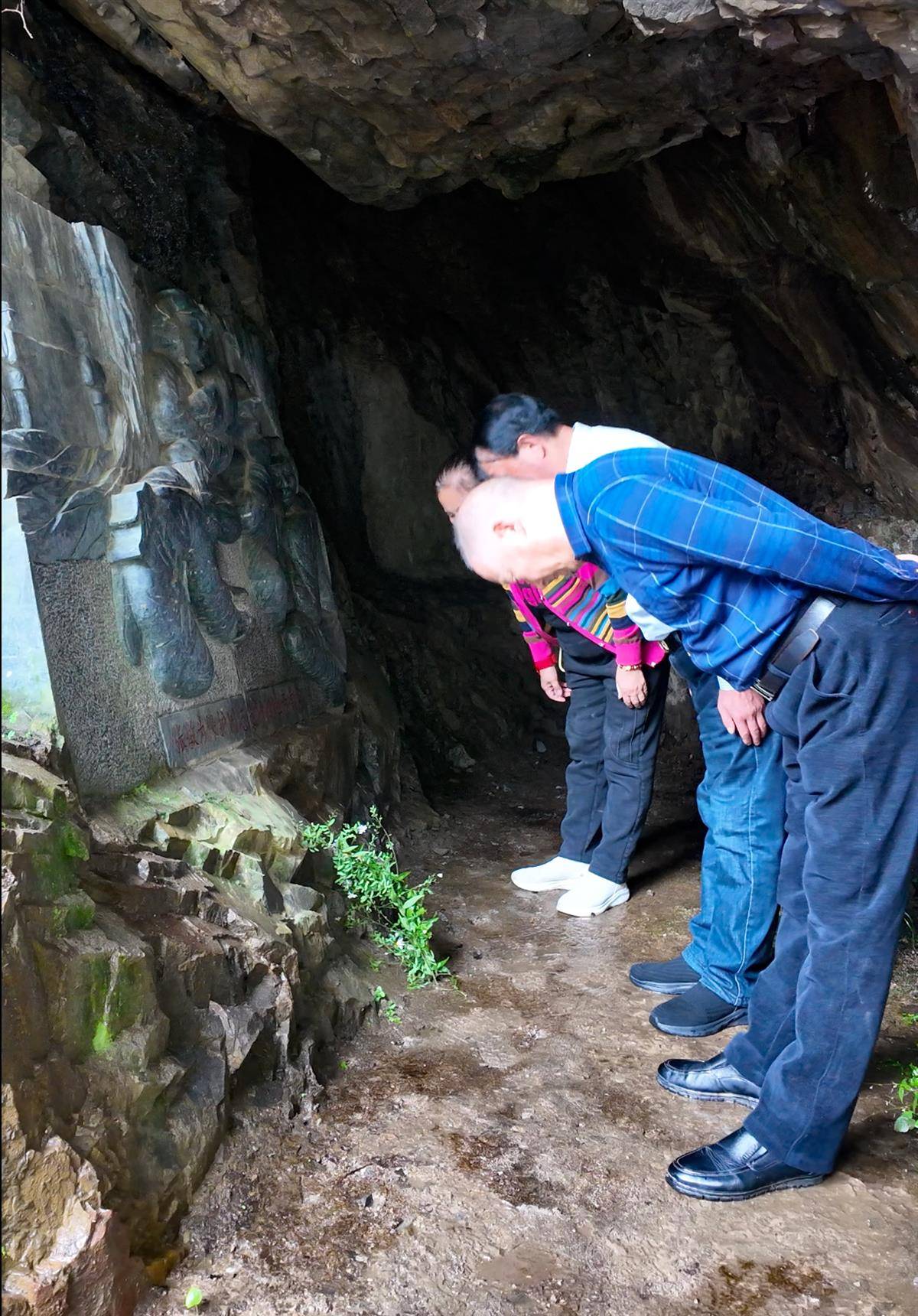 2025年10月17日,在金刚台张敏曾经战斗生活过的红军洞内,张敏后人向她的壁画鞠躬致敬。(湖北日报全媒记者 何宇欣 摄)
