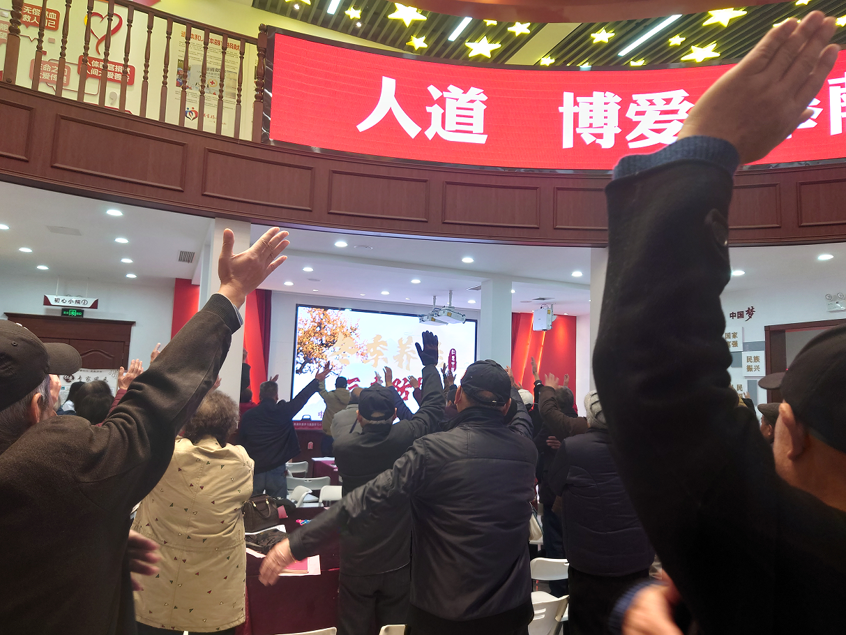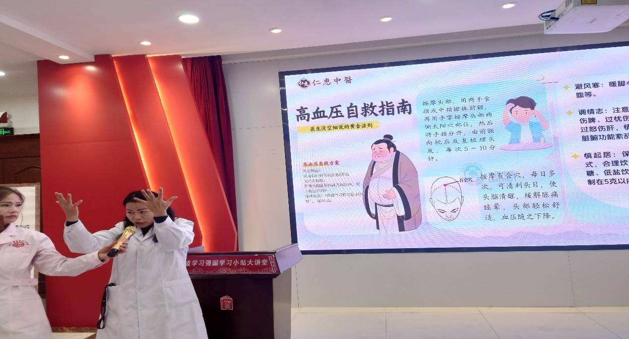 讲解结束后,仁惠中医馆医师武珍元带领居民练习简易肩颈拍打操。“双手空心掌,从颈部两侧向下拍打至肩背,力度以酸胀舒适为宜,每次拍打30下。”武珍元一边示范动作要领,一边讲解拍打穴位的养生原理,居民们跟着节奏整齐练习,现场洋溢着热闹的互动氛围。