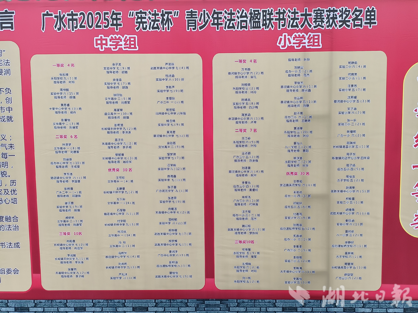 颁奖环节成为开幕式的亮点。市领导及相关单位负责人依次为2025年广水市“宪法杯”全国楹联大赛、青少年法治书法大赛优秀奖、三等奖、二等奖、一等奖获得者及优秀组织单位、优秀指导老师代表颁奖。手持获奖证书的青少年选手们脸上洋溢着自豪的笑容,他们表示,将以此次获奖为动力,继续深耕书法艺术,主动学习宪法知识,做法治精神的传播者与践行者。