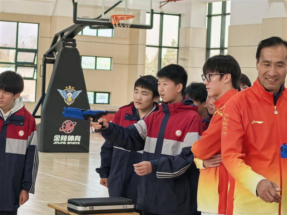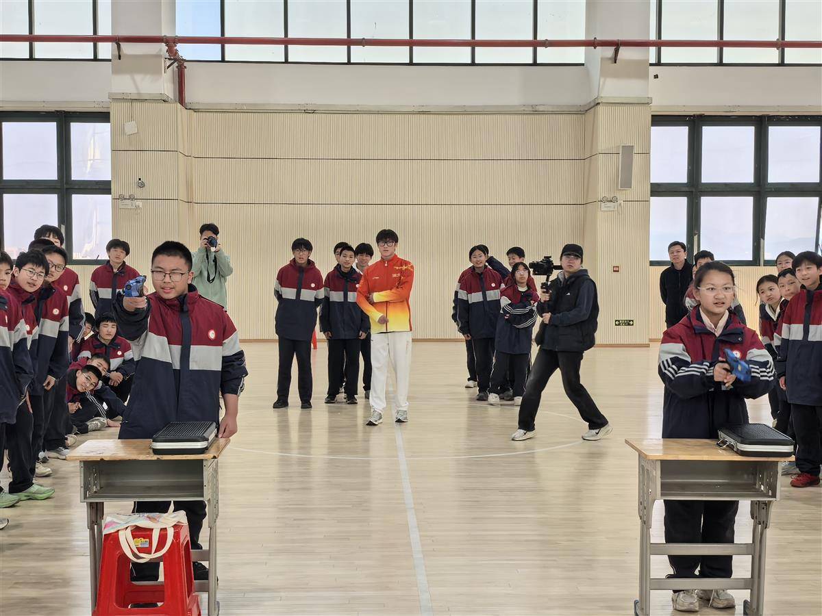 冠军体育课上,陈柏良为同学们带来了专项教学——现代五项中的“激光跑”项目,“激光跑考验的是速度与精准的平衡,跑步时要积蓄力量,射击时要快速平静下来,这和学习中‘张弛有度’是一个道理。”陈柏良将同学们分为两组,指导激光枪持握姿势、瞄准技巧等。体育课最后,两组各选出5人进行“短距离跑步后快速射击”的模拟比赛,现场的脚步声、加油声与欢笑声交织。“同学们首次接触激光跑项目都很兴奋,也能看出来他们在射击方面的基本技术,以及身体感觉都很不错。”陈柏良说。
