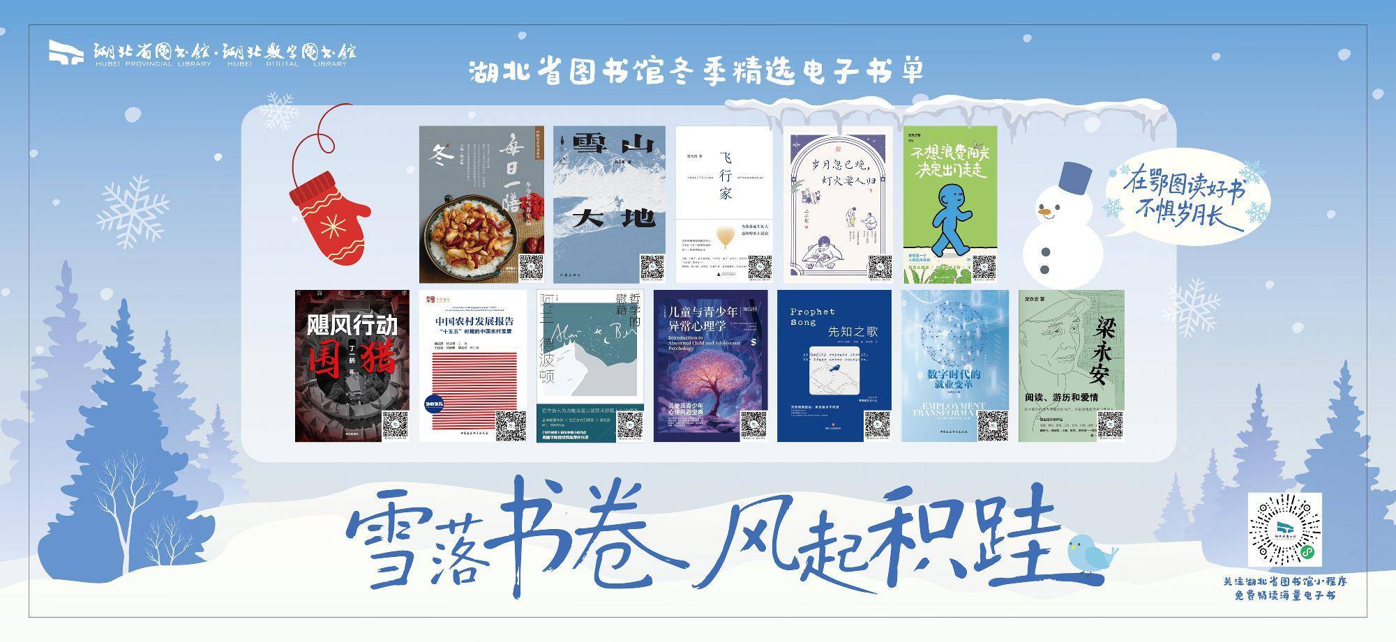 湖北日报讯 (记者王晶、通讯员何菁、段雪晴)气温逐渐走低,阅读的氛围在升温。近日,湖北省图书馆精心策划的“雪落书卷 风起积跬”冬日主题电子书单,正式在武汉轨道交通温情上线。