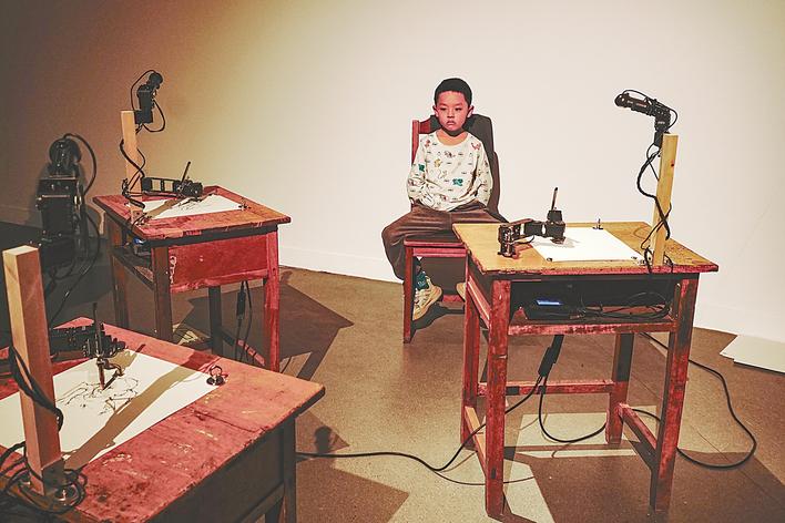 湖北日报全媒记者在展览现场注意到,作者特雷塞特在人群中静静观察机器人作画。“为何这三台机器人都是左撇子?”记者问道。特雷塞特神秘一笑:“因为我是左撇子。”他介绍,这个装置受到自己童年时代学习绘画经历的影响,这是他练习绘画的开始,“当机器人成为画家时,用机械还原绘画的过程,能够让人们重新思考艺术家的创作工作”。