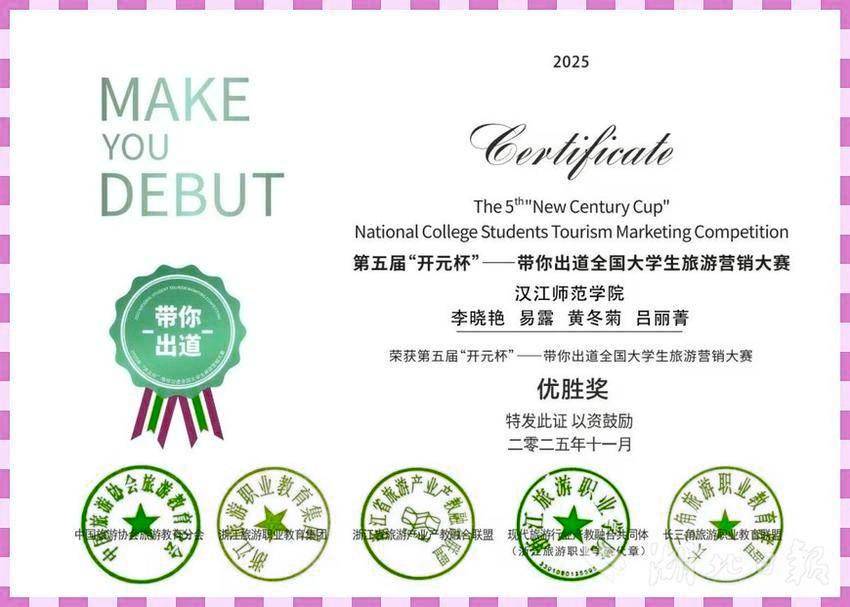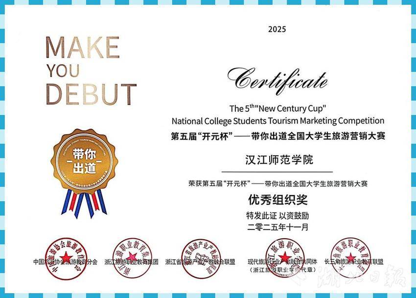 湖北日报讯(通讯员李晓艳)近日,第五届“开元杯”带你出道全国大学生旅游营销大赛在浙江落幕。汉江师范学院首次组队参赛,便从全国百余所院校、200余支队伍的激烈角逐中脱颖而出,荣获全国优胜奖与优秀组织奖。