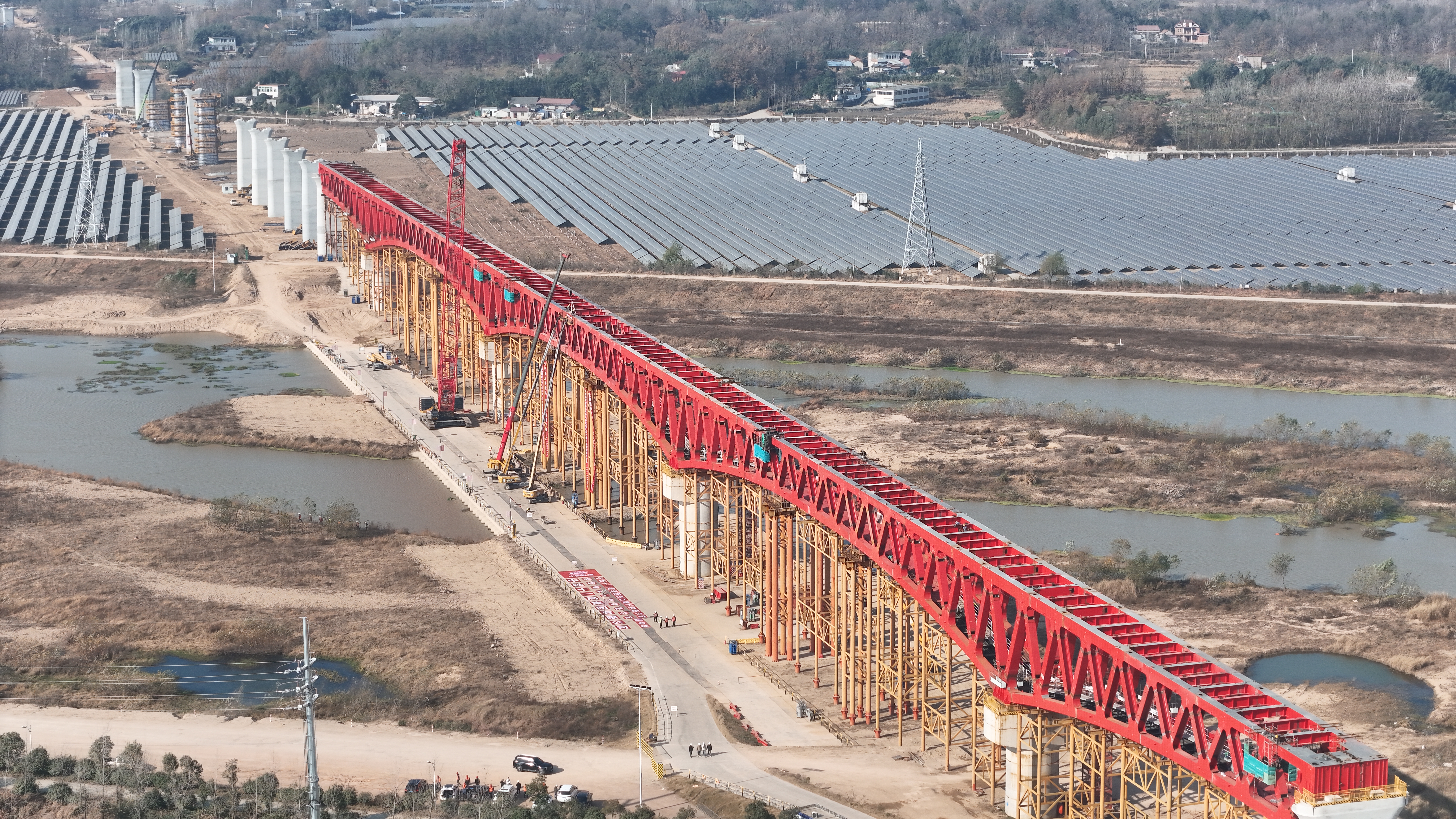 作为沪渝蓉高铁合武段的“咽喉”工程,金寨史河特大桥全长540米,3个主跨如长虹卧波般跨越河道,最大跨度达132米。据了解,此次合龙创下四个“全国第一”:国内高速铁路首座上承式钢桁梁桥、国内高速铁路首座混凝土板-钢桁双结合连续梁桥、国内最大跨度无预应力桥面板连续结合梁桥、国内高速铁路首座长联全焊接连续钢桁梁桥,标志着我国高铁桥梁建设取得重要技术突破。