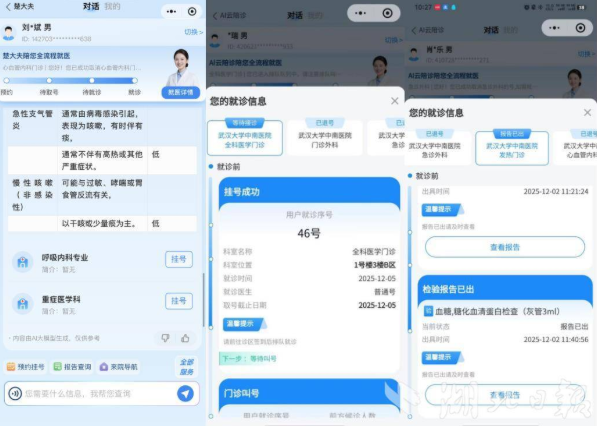 这个问题正在被解决。12月6日,AI云陪诊“楚大夫”发布上线,通过这一入口,能挂15家医院的号,未来还将覆盖全省所有三甲医院。这是由湖北省卫生健康委统筹指导、湖北大数据集团开发打造的全省统一数字健康人,旨在以智慧医疗为老百姓提供更高质量、更便捷的就医服务。目前,平台已经完成包括同济医院、协和医院、省人民医院、中南医院、省妇幼保健院等15家重点医院的接入工作,市民可“一站式”查询所需就诊的科室、号源,节省不少时间。