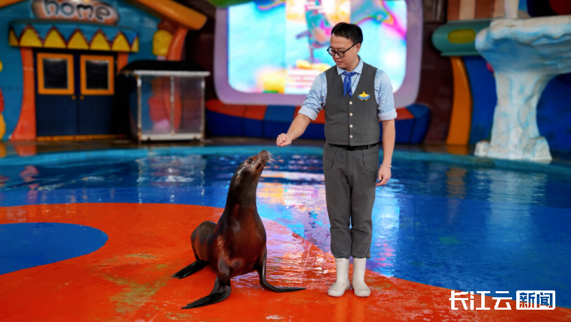 13:30,伴随着欢快的音乐响起,海狮“小小”闪亮登场,一出场便重现全网爆红的“发癫”名场面:脑袋左右快速摇晃,身体随着节奏随性扭动,没有固定舞步却自带超强节奏感,时而歪头卖萌,时而“放飞自我”,将“一半魔丸一半灵珠”的反差萌展现得淋漓尽致,瞬间点燃全场气氛,现场欢笑声此起彼伏。