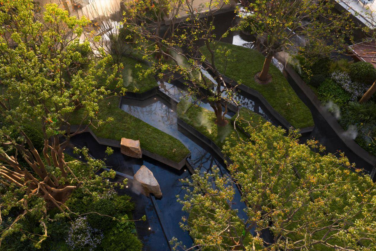 光谷壹号院借山景、引水势,依托自然山地高差、采用600吨天然石材,打造了“园林不见砖”的台地景观;于武汉首创超40米长的安哥拉黑石材瀑布群,并引入西班牙油橄榄、羽毛枫等植被群落,让业主的生活与自然相融、共生。