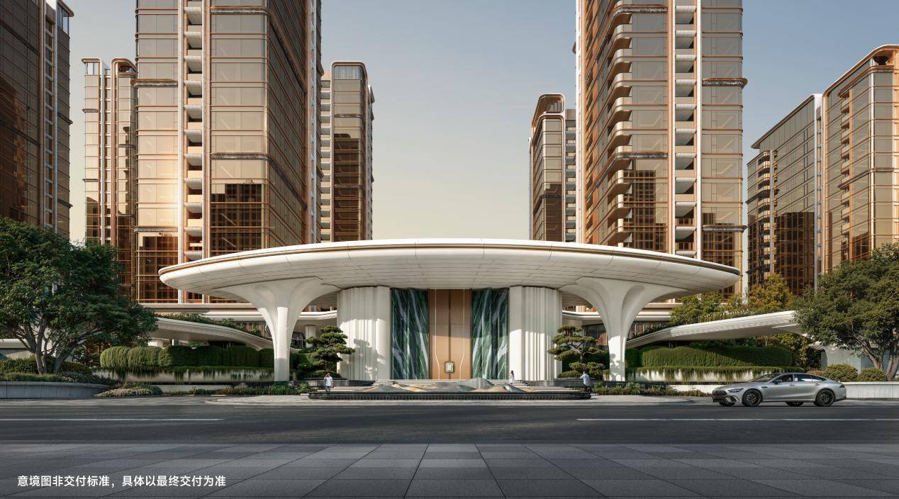 主入口以“城市雕塑”为理念,打造连续约230米的界面,约60米宽度主门与约12米悬挑,以恢宏气势致敬城市,让归家成为审美体验,让建筑成为城市记忆。