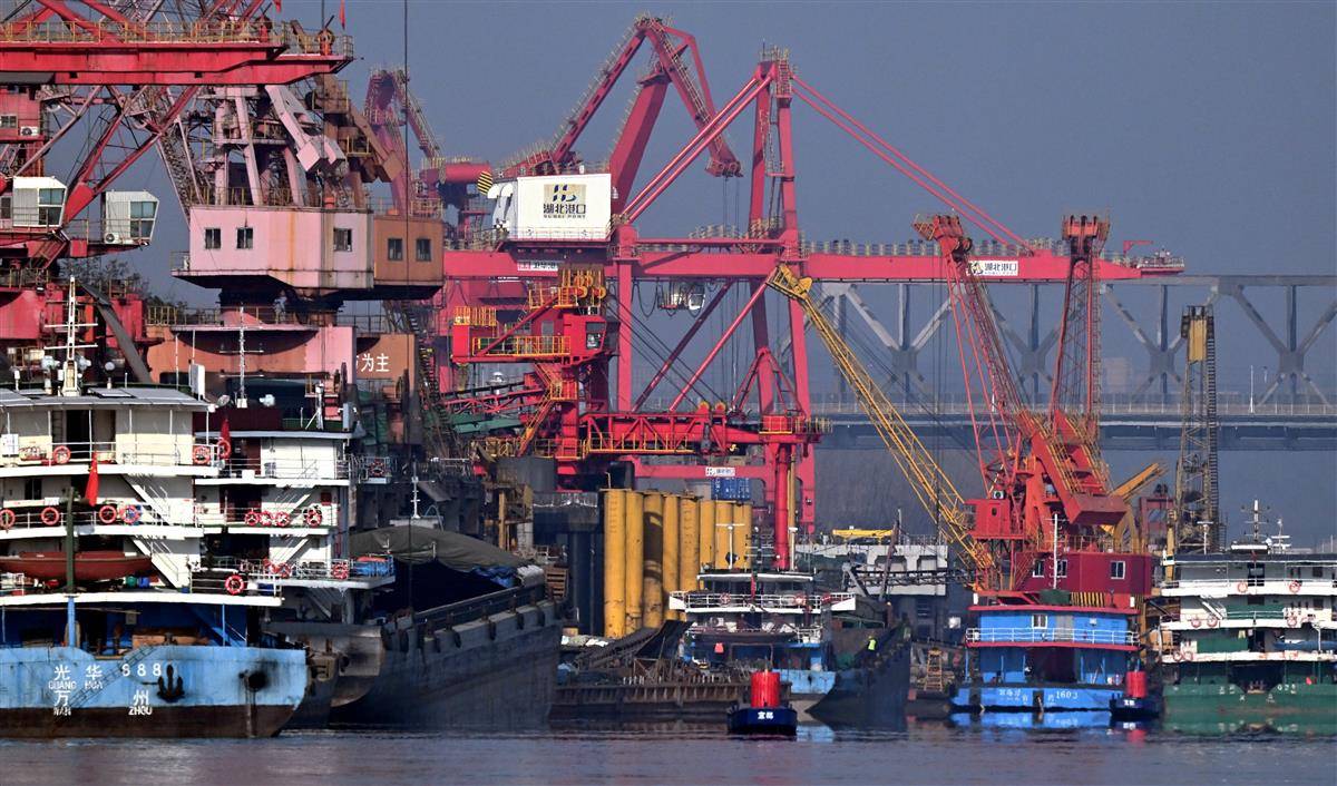 2月8日,长江宜都枝城段宁通物流港口,货船往来穿梭,岸吊高效起落……一片繁忙景象。