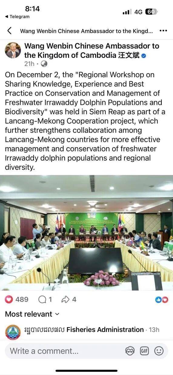 研讨会上,中国科学院水生所研究员王丁担任联合主席,相关专家分享了长江江豚保护方案。目前,当地电鱼、水坝建设、气候变化等仍威胁江豚生存,澜湄各国将进一步强化区域合作,以中国方案为蓝本,持续守护湄公河水生生物多样性。