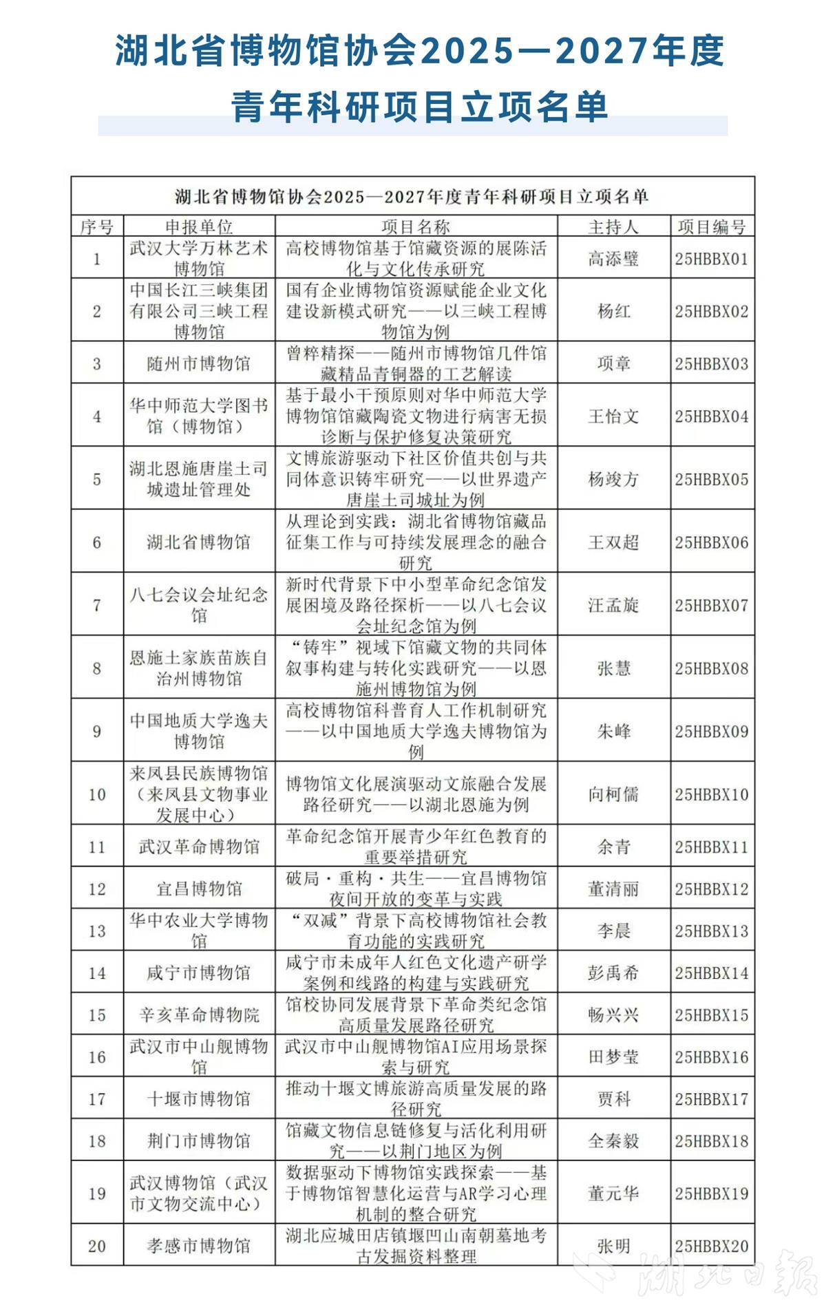 湖北省博物馆协会2025—2027年度青年科研项目立项名单