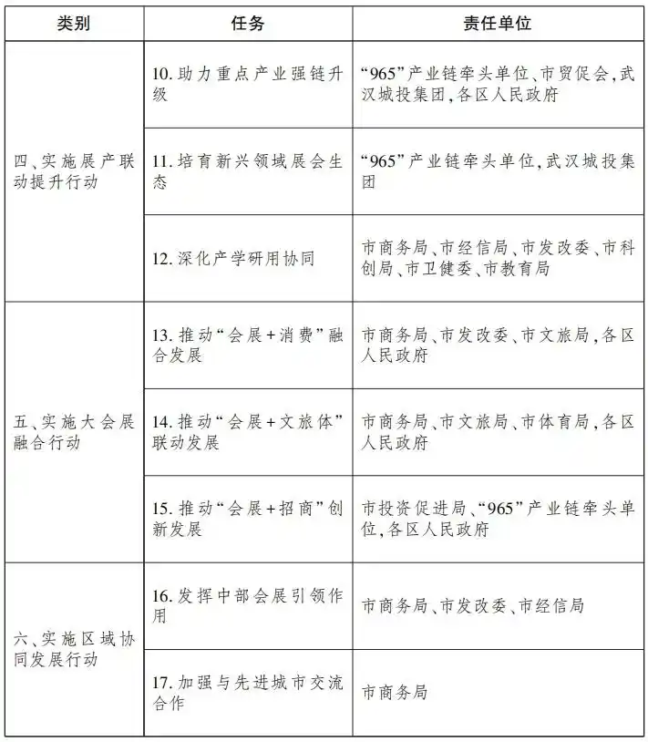 16.发挥中部会展引领作用。发挥我市会展业在全省的龙头作用,推动会展业与武汉都市圈特色产业融合,探索开展汉襄宜“金三角”会展交流合作,实现品牌展会展商资源互通共享。鼓励武汉场馆、会展企业与其他市州合作,在武汉举办服务当地特色产业发展的展会活动,共享会展资源。联动长江中游城市群,以中国中部投资贸易博览会、中非合作论坛、中国国际机电产品博览会、世界大健康博览会、中国软件创新发展大会等重要会展活动为平台,加强产业技术交流与项目合作。