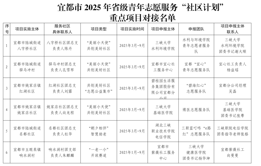 今年3月,宜都团市委联合三峡大学团委、湖北三峡职业技术学院团委、宜都宜心社工开展“社区计划”青年志愿服务项目校地社共建,组织八字桥社区、名都社区、驿马冲村、姚家店社区、红湖社区、响水洞村等6个社区(村)与高校4个学院团委、社会组织一一结对共建。