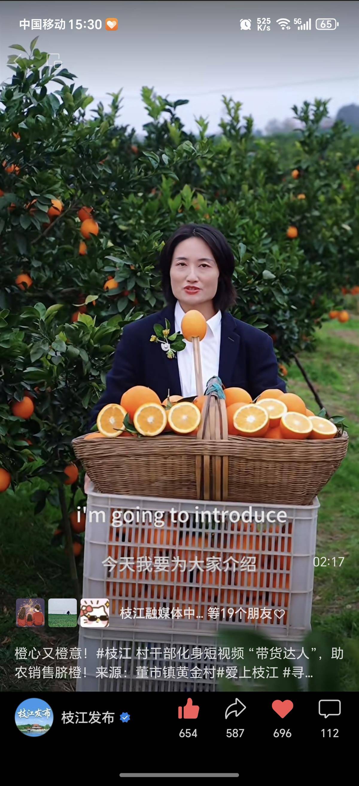 湖北日报讯(记者高伊洛、通讯员陈黄奎)“我们的脐橙,不催红,不打蜡,自然熟!”“黄金村,orange,very good!”最近,枝江市董市镇黄金村、曹店村、平湖村等12个村的村干部们,接连在新媒体平台发布短视频,抱团展示董市脐橙的产业规模与品质优势。短短5天,吸引全国20余省市客商咨询并签订采购合同,订单总量超200万斤。