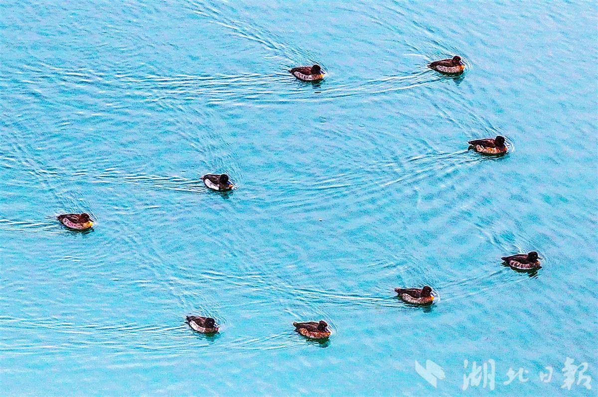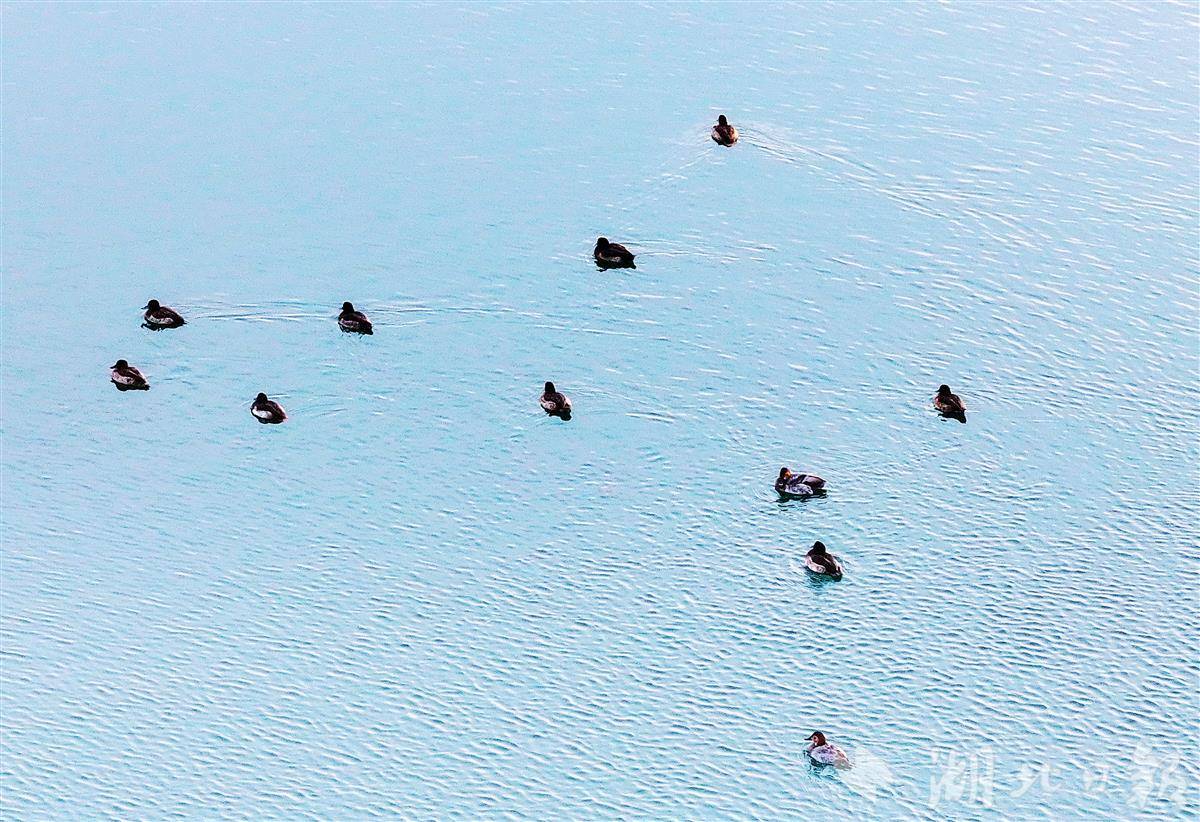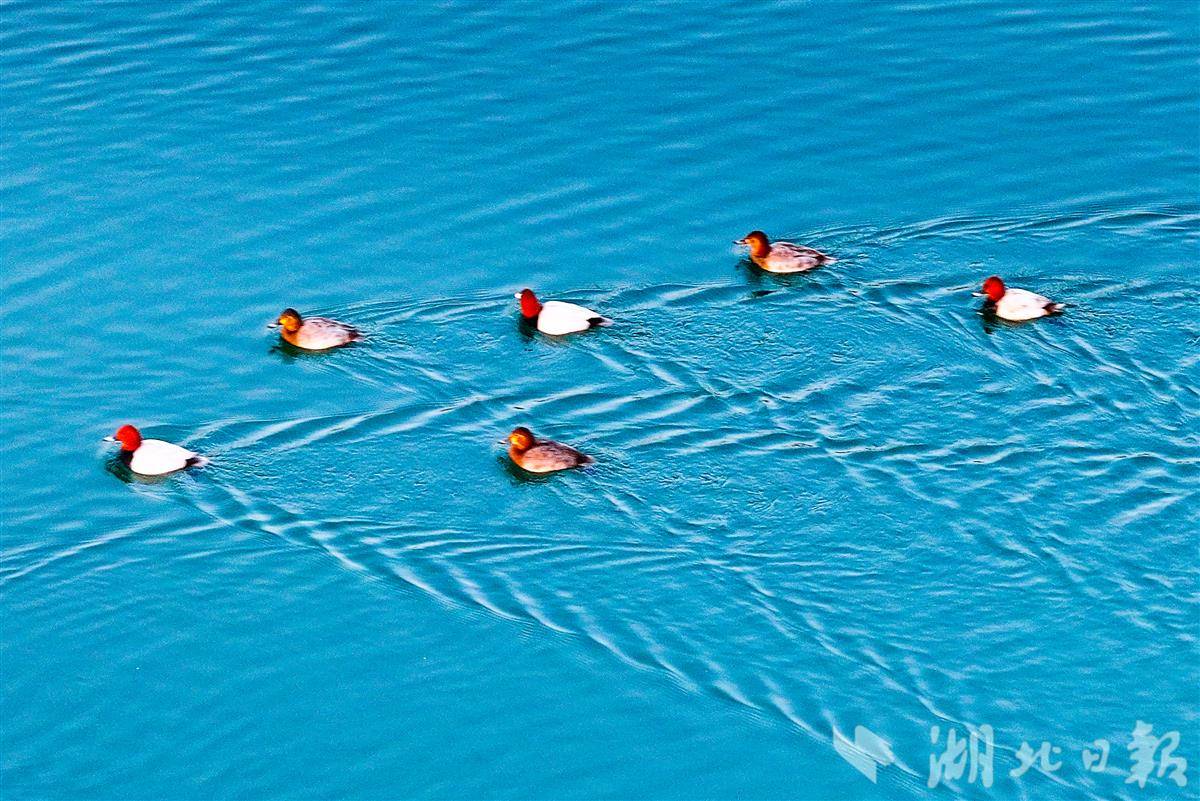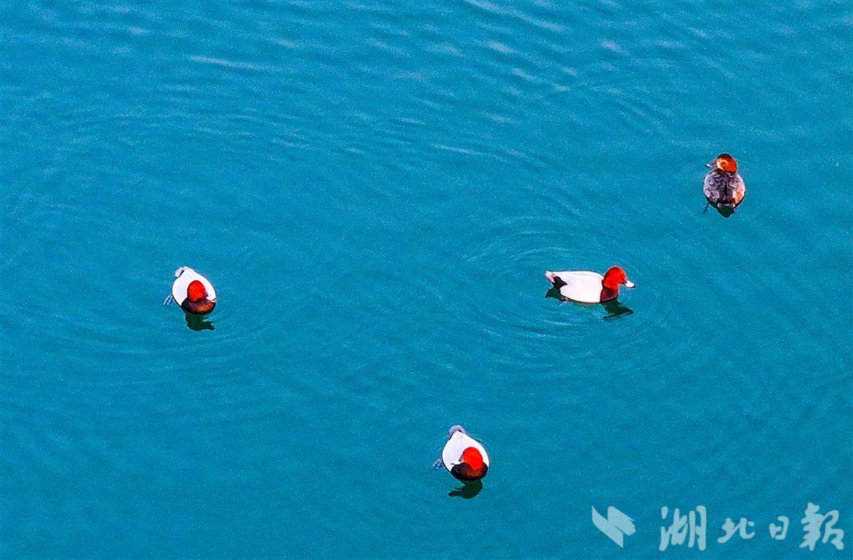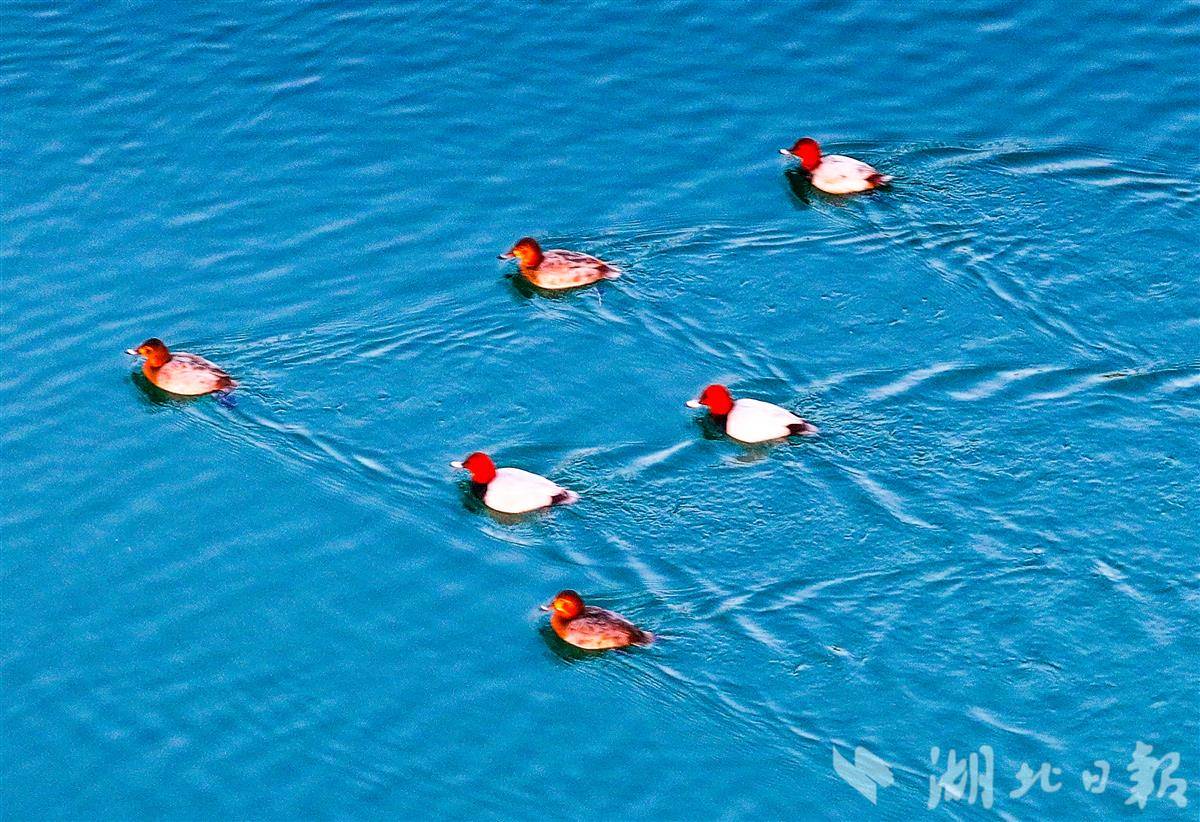 12月5日,十堰市郧阳湖国家湿地公园内,十几只红头潜鸭在觅食嬉戏。