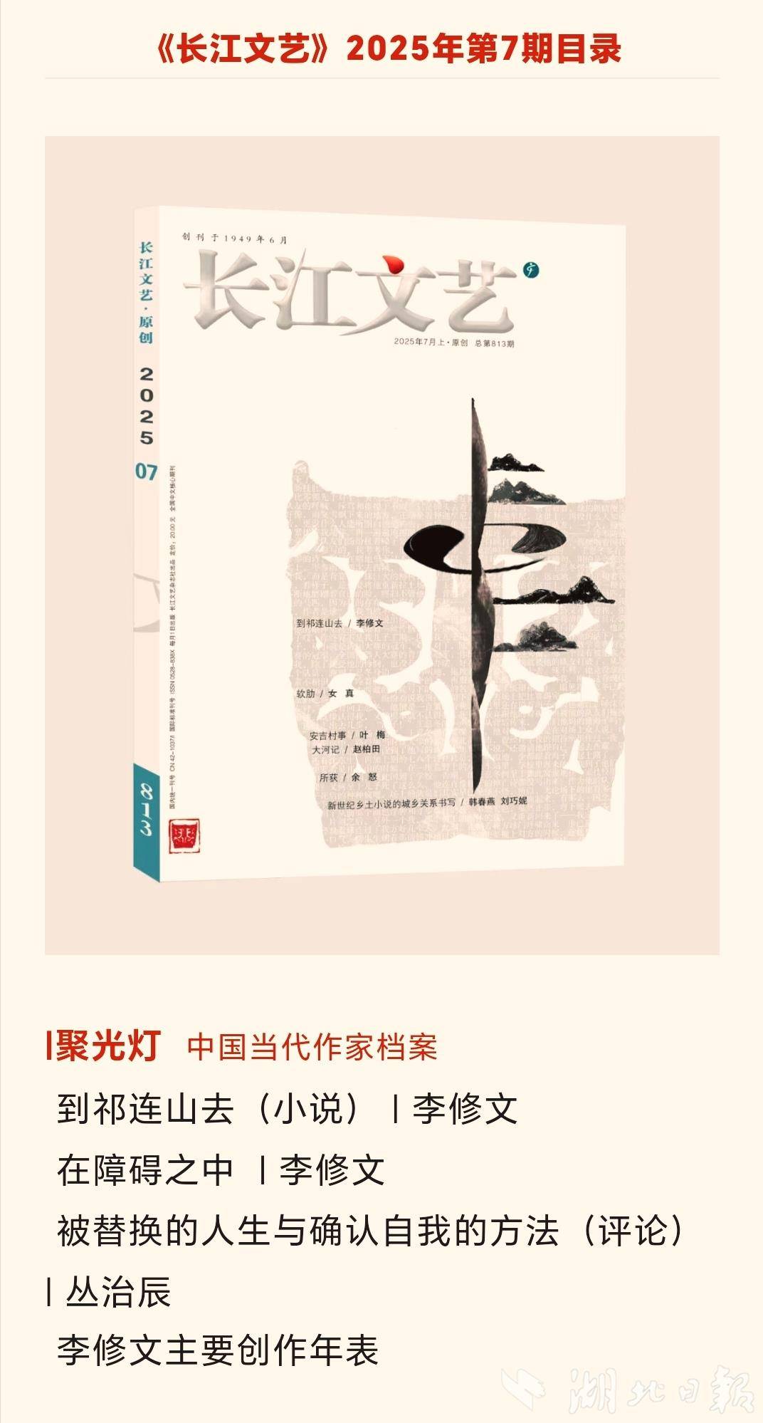 湖北日报讯(记者农新瑜、通讯员沈作)近日,《十月》年度中篇小说榜(2025)评选结果在云南昭通揭晓。其中,著名作家、湖北省作协主席李修文创作的中篇小说《到祁连山去》(首发于《长江文艺》2025年第7期)入选,为全国5部入选佳作之一。