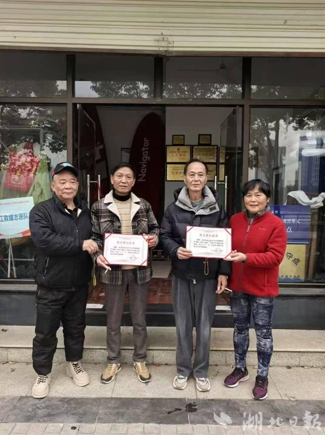 湖北日报讯(记者胡雯洁、通讯员郑惠芳)“这份荣誉是对我们救人举动的肯定,更是对所有长江边生命守护者的鼓舞!”近日,武汉长江救援志愿队汉江湾支队队员李强华、邓万喜接过见义勇为奖证书时激动地说。