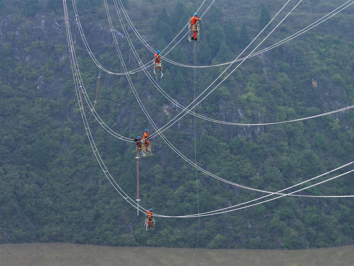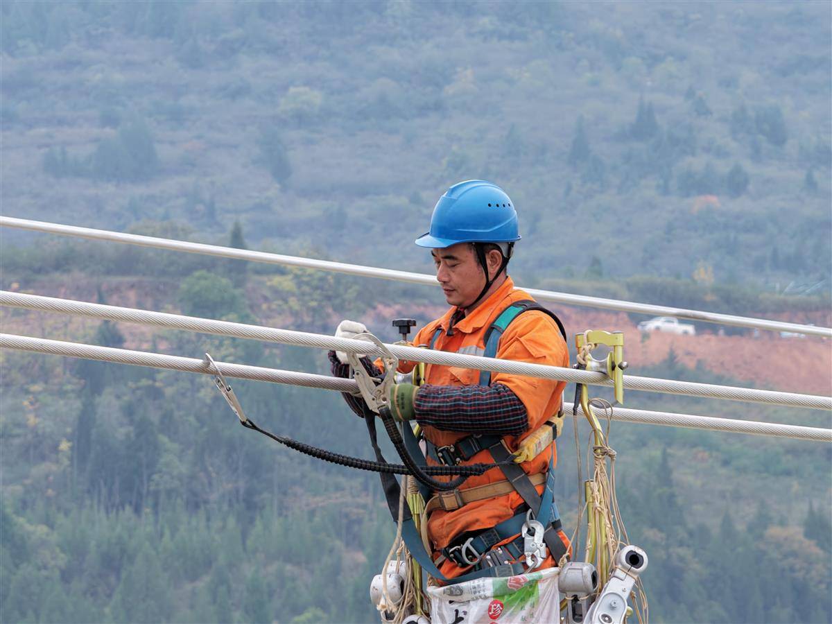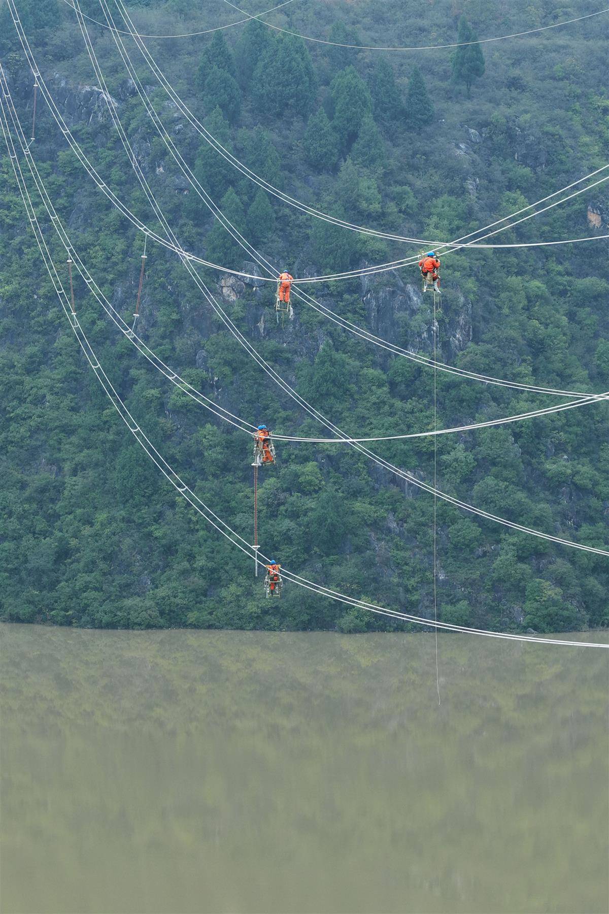 在十堰郧阳区青山镇琵琶滩村的汉江河谷,国网十堰供电公司施工人员在高空导线上安装间隔棒等线路附件。(湖北日报通讯员 郝金鑫 摄)