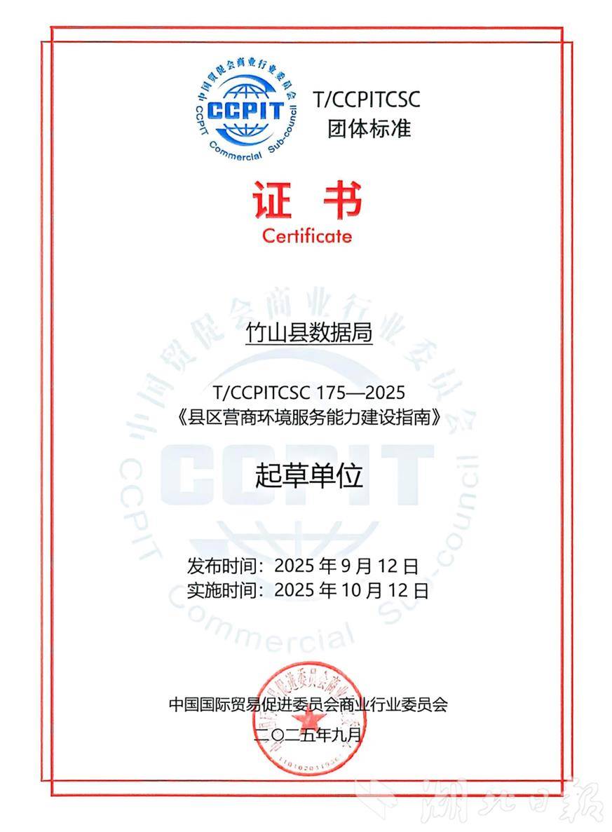今年9月,中国贸促会商业行业委员会发布了《县区营商环境服务能力建设指南》,竹山县数据局成为起草单位之一,为全国县域层面以标准化赋能营商环境提供了鲜活样本。