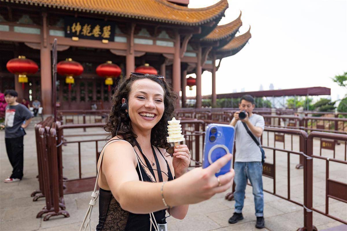海外游客拿着黄鹤楼文创雪糕在景区拍照打卡。(湖北日报全媒记者 何宇欣 摄)