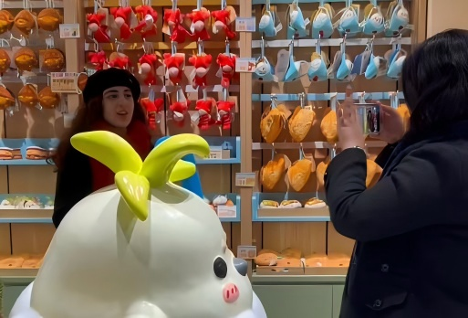 “看,这款玩偶会说话!”12月5日,两位欧洲游客在武汉江汉路“全员饿人”文创店的货架前拍摄短视频,拿起一款造型逗趣的“蒜鸟”玩偶按下发声键,随即传出地道的武汉方言。