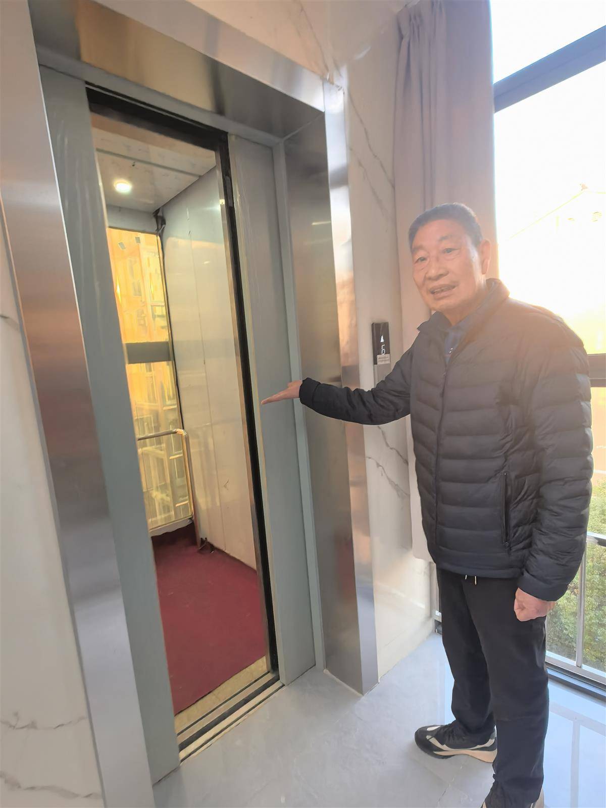 饶西国老人乘坐电梯下楼。(通讯员 陈峥嵘 摄)