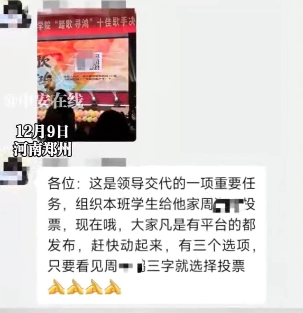 近日,有河南的学生反映,其所在的班级群内有人下发通知,号召给一位就读于浙江某大学的学生进行“校园十佳歌手”投票,并称“这是领导交代的一项重要任务”,引发网络关注。
