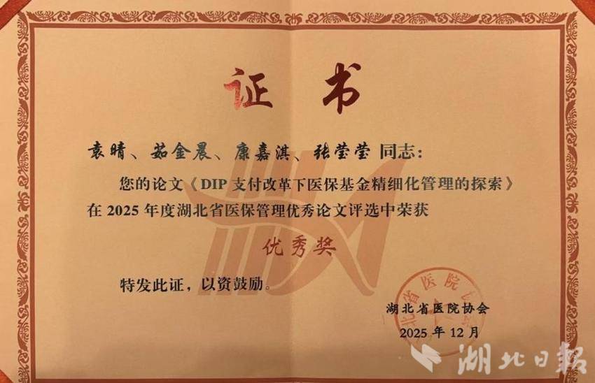 湖北日报客户端讯(通讯员茹金晨、袁晴)近日,2025年度“湖北省医保管理优秀论文”评选结果揭晓。钟祥市人民医院提交的论文《DIP支付改革下医保基金精细化管理的探索》荣获优秀奖。该论文由医院DIP工作小组团队完成,聚焦按病种分值付费(DIP)改革下的管理创新,为医保基金精细化管理提供了实践思路。