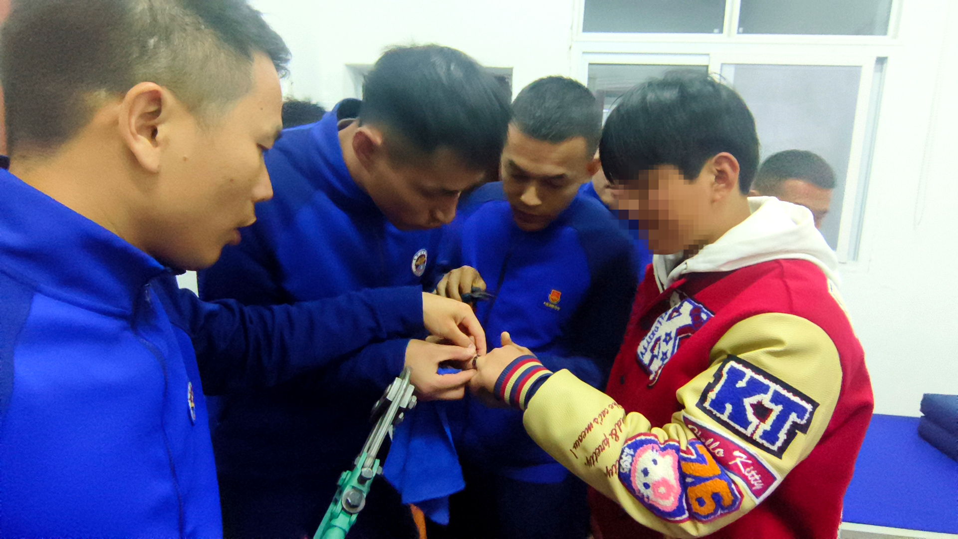 消防救援人员仔细检查后发现,男孩手指被一枚不锈钢戒指紧紧卡住,已经出现明显红肿,若不及时摘除,可能会影响血液循环,引发更严重的后果。消防救援人员立即行动,一人紧握断线钳,另外两人小心翼翼固定住男孩的手指,防止其晃动受伤。随着“咔嚓”一声脆响,戒指应声断开,被成功取下。整个救援过程仅用两分钟,男孩手指并无大碍。