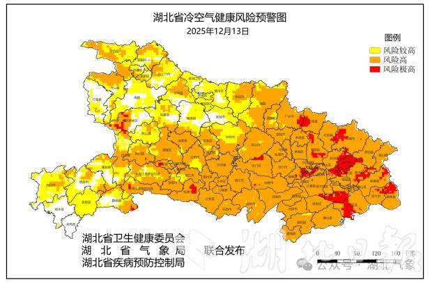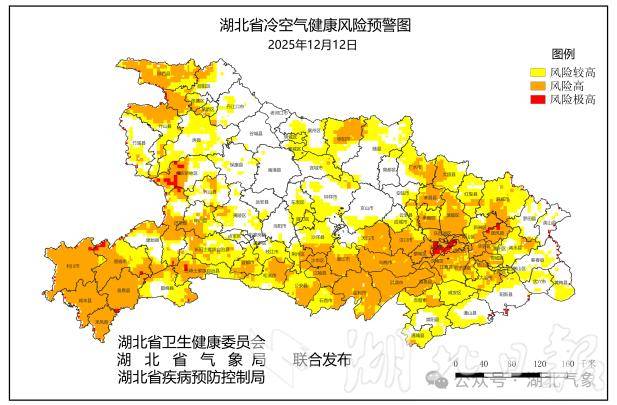 湖北省卫生健康委员会、湖北省气象局、湖北省疾病预防控制局联合发布《湖北省人体健康气象风险预警》,根据监测和冷空气健康风险模型预报,12日十堰西北部、恩施大部、宜昌西部、神农架西部、天门、仙桃、潜江、荆州大部、孝感东部、武汉大部、鄂州大部冷空气健康风险高,十堰南部、襄阳东部、宜昌南部、荆门西部、随州北部、咸宁、黄石北部、黄冈中北部冷空气健康风险较高。
