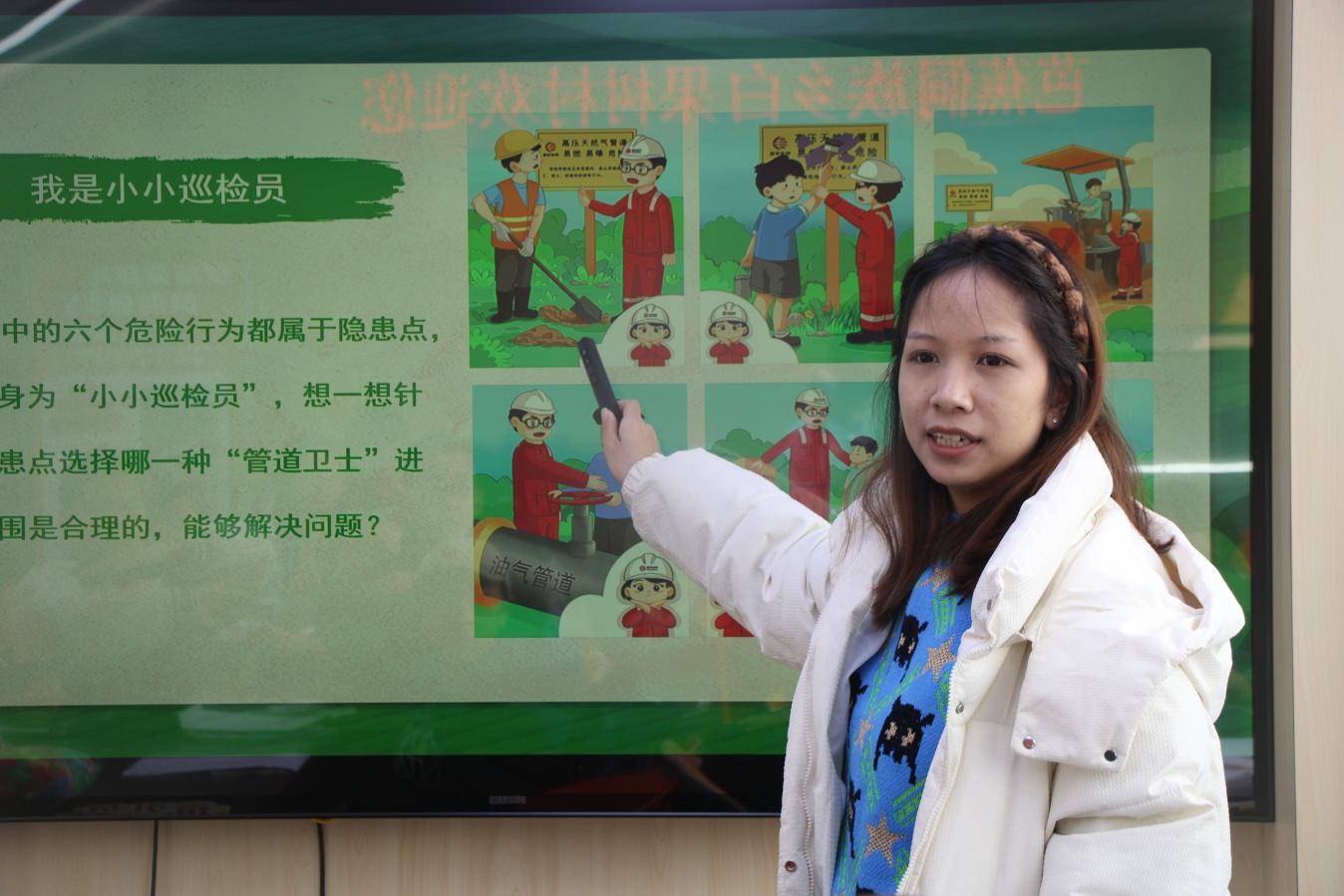 在高年级专场,志愿者首先界定石油、天然气、管道及管道运输核心概念,结合生活实际说明其分布情况。通过组织小组讨论,引导学生对比不同运输方式优劣,进而明确管道运输对于石油、天然气运输的适配性与重要性。随后,宣讲员系统介绍地面标识、无人机巡查、视频监控、光纤报警器四种管道保护技术,通过“技术匹配”小游戏帮助学生巩固记忆;围绕“六不”原则,讲解管道保护具体要求与注意事项。