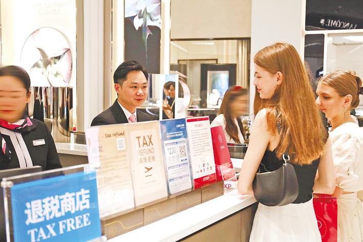 7月1日,两位外籍顾客在武汉SKP选购商品后办理退税手续。