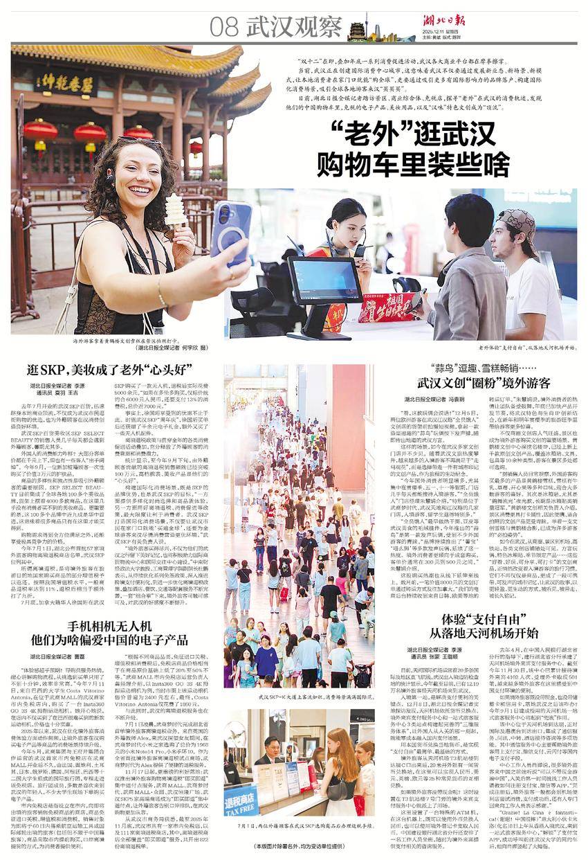 日前,湖北日报全媒记者踏访景区、商业综合体、免税店,探寻“老外”在武汉的消费轨迹,发现他们的中国购物车里,免税的电子产品、美妆用品,以及“汉味”特色文创成为“顶流”。