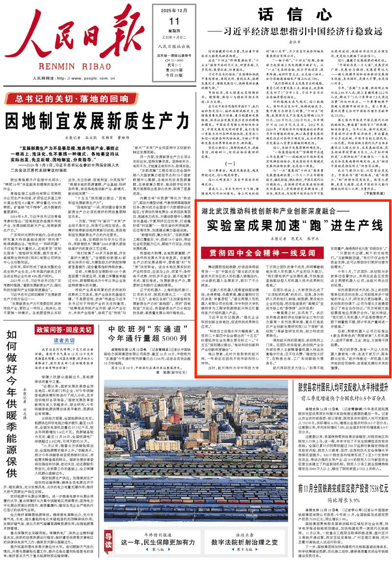 今天(12月11日),人民日报聚焦我省科技创新和产业创新深度融合,在一版“贯彻四中全会精神一线见闻”专栏推出《湖北武汉推动科技创新和产业创新深度融合——实验室成果加速“跑”进生产线》。以下为报道全文: