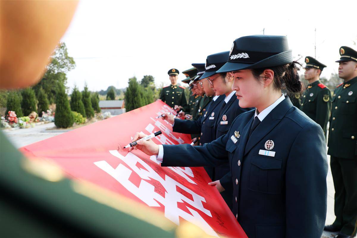 “我志愿加入中国共产党,拥护党的纲领,遵守党的章程……”官兵们面向鲜红的党旗,重温入党誓词。随后,他们在印有“铭记历史、缅怀先烈”的横幅上签字铭志,向革命烈士敬献鲜花。