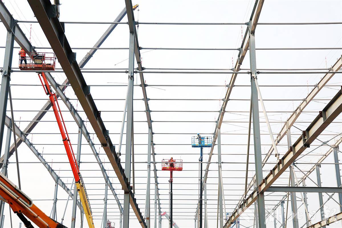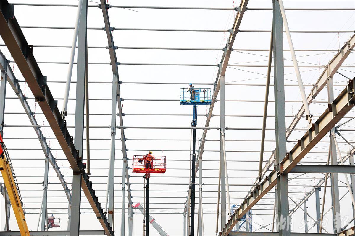12月11日,位于宜昌猇亭区的远景动力智能锂电池生产基地项目工地,工人正在24米高空安装标准化厂房架构。