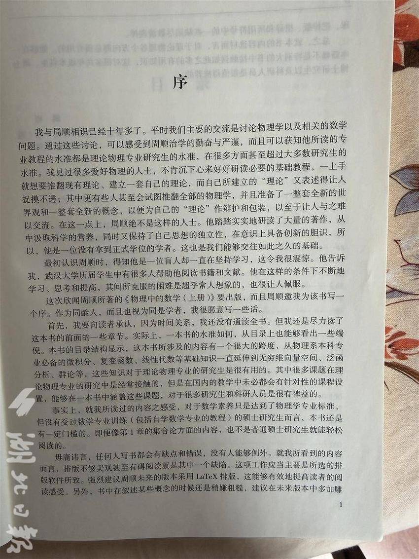 阅读过《物理中的数学》上册、现就读于武大物理学院严济滋班的大三学生郑绍平说:“顺叔的物理学专业知识很扎实,他对一些公式的应用对我很有启发。”