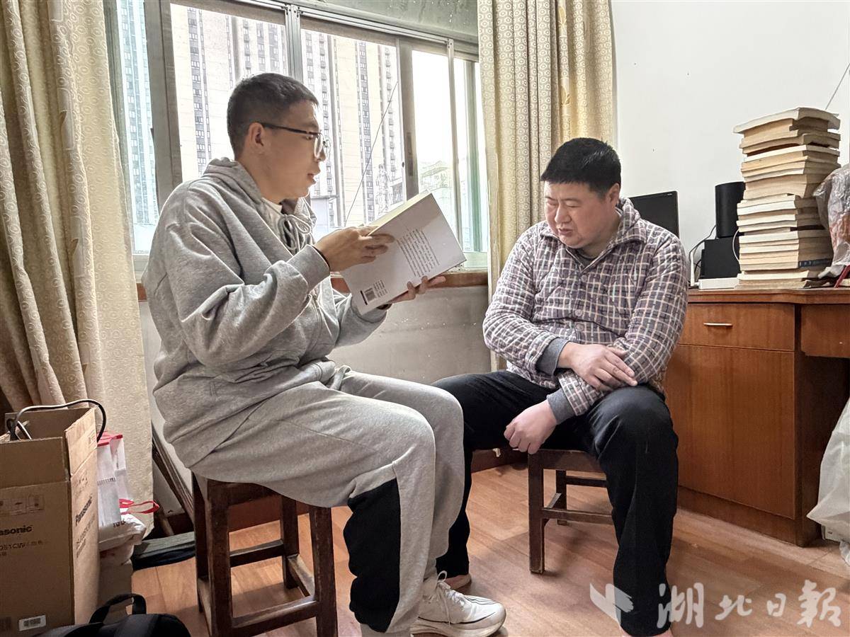武汉大学物理科学与技术学院学生李乐煜为周顺读物理专业书籍。