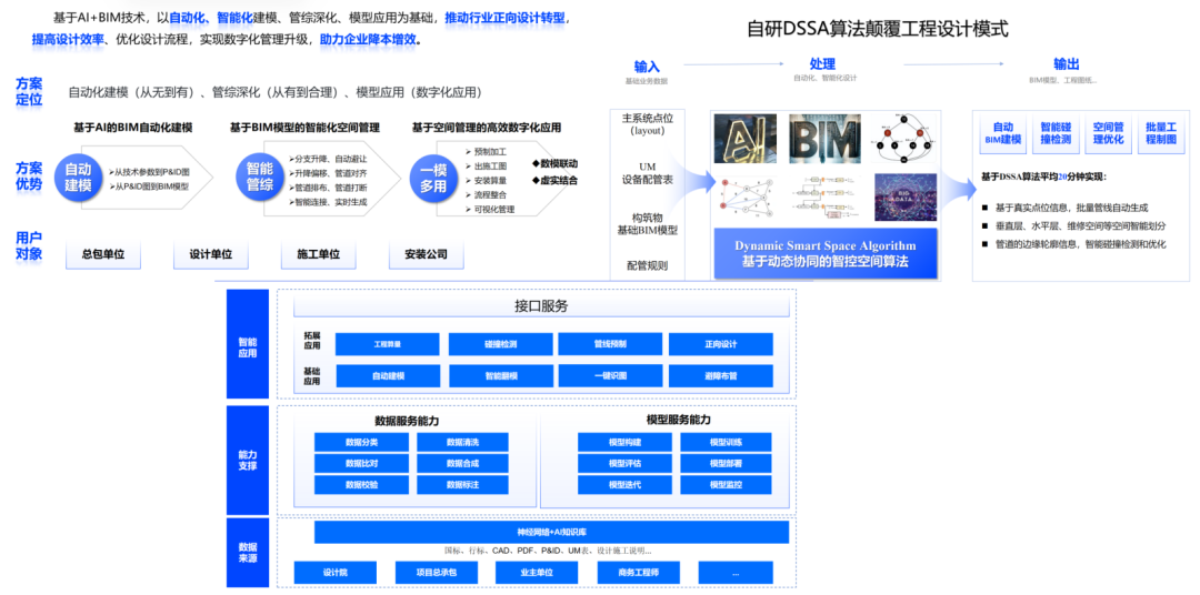该平台针对复杂机电工程设计中长期存在的效率低下、协同困难、知识传承难等核心痛点,以“AI+BIM”深度技术融合为核心,构建基于大模型的技术底座,并依托30余个自研小模型,形成一套能够深度学习专业领域知识的全新一代智能化设计与建模系统。