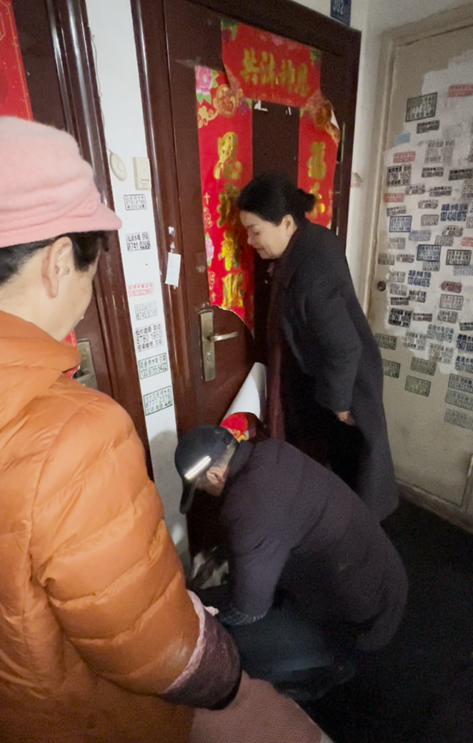 物业工作人员接报后迅速行动,一方面同步联系张婆婆家属,另一方面将情况通报正在三星苑小区5栋检查施工安全的社区工作人员,并安排安保人员李奎赶赴现场。社区工作人员5分钟内抵达,发现敲门无人应答但屋内仍有呼救声,经现场快速评估并获家属远程授权后,以最小破坏方式破门将房门打开。