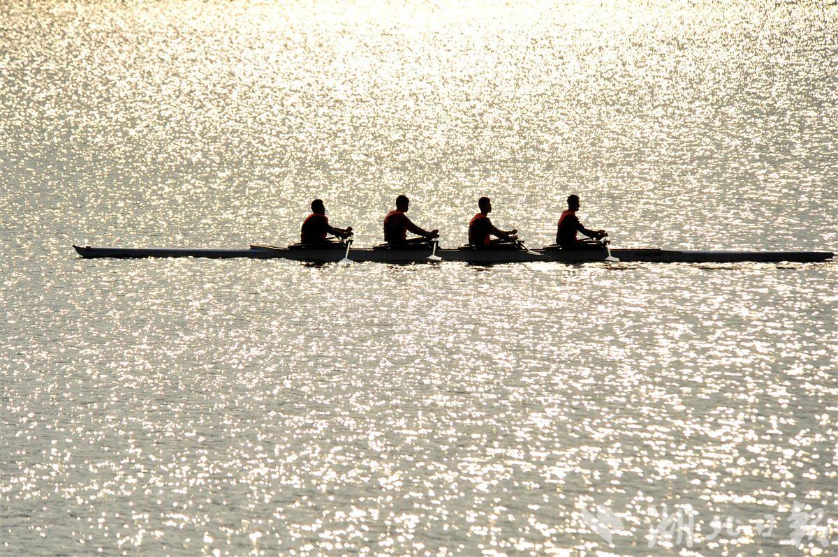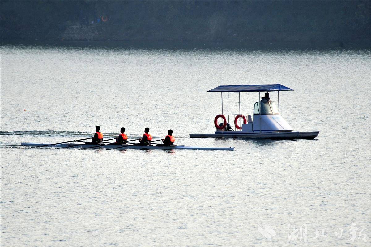 12月7日,运动员在宜昌市夷陵区境内的长江支流黄柏河平湖前湾水域进行赛艇水上运动训练。