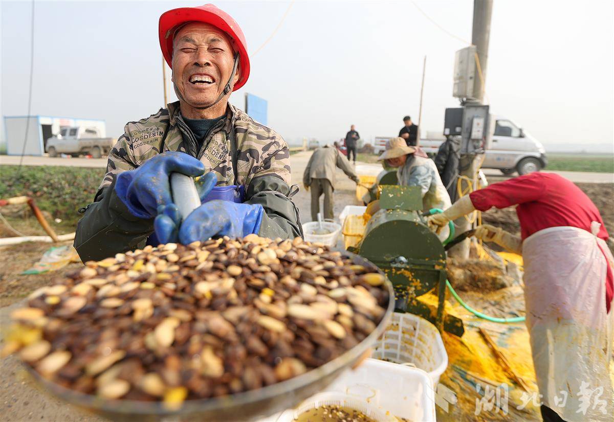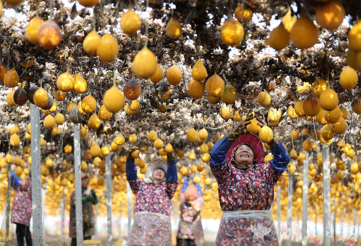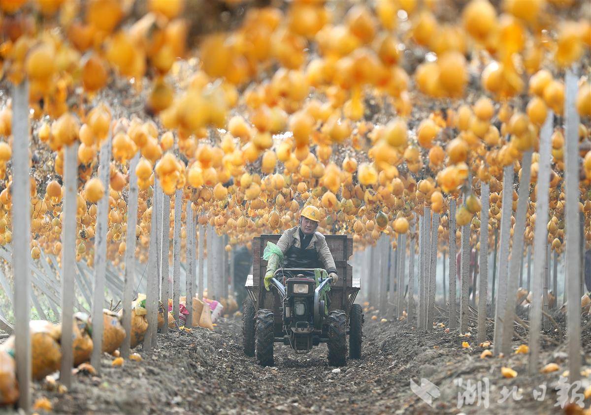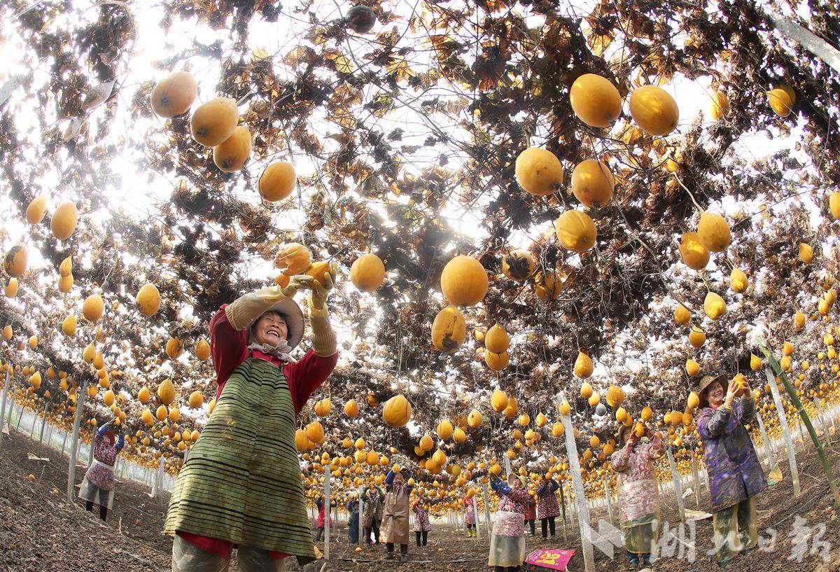 12月11日,钟祥市柴湖镇黄岔堤村150亩瓜蒌迎来丰收。藤架下,村民穿梭其间采摘果实,田间地头一派繁忙景象。