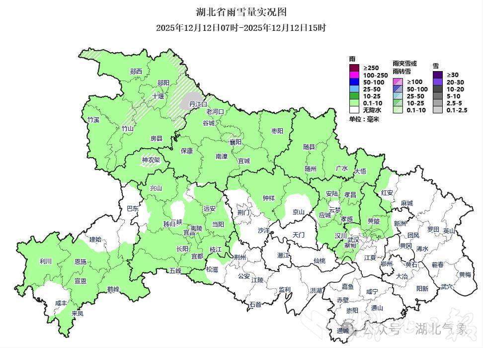 气象专家介绍,12日白天,鄂西、江汉平原北部、鄂东北西部地区出现小雨,武当山、郧西等高山区出现降雪,丹江口出现雨夹雪或雪。气温迎来大跳水,鄂西北、江汉平原、鄂东北西部地区15时气温下滑8至15℃,其他地区下滑3至7℃。除恩施及鄂东南外,湖北的气温普遍降至个位数,其中十堰、襄阳、随州、荆门北部仅0至3℃,寒意十足。