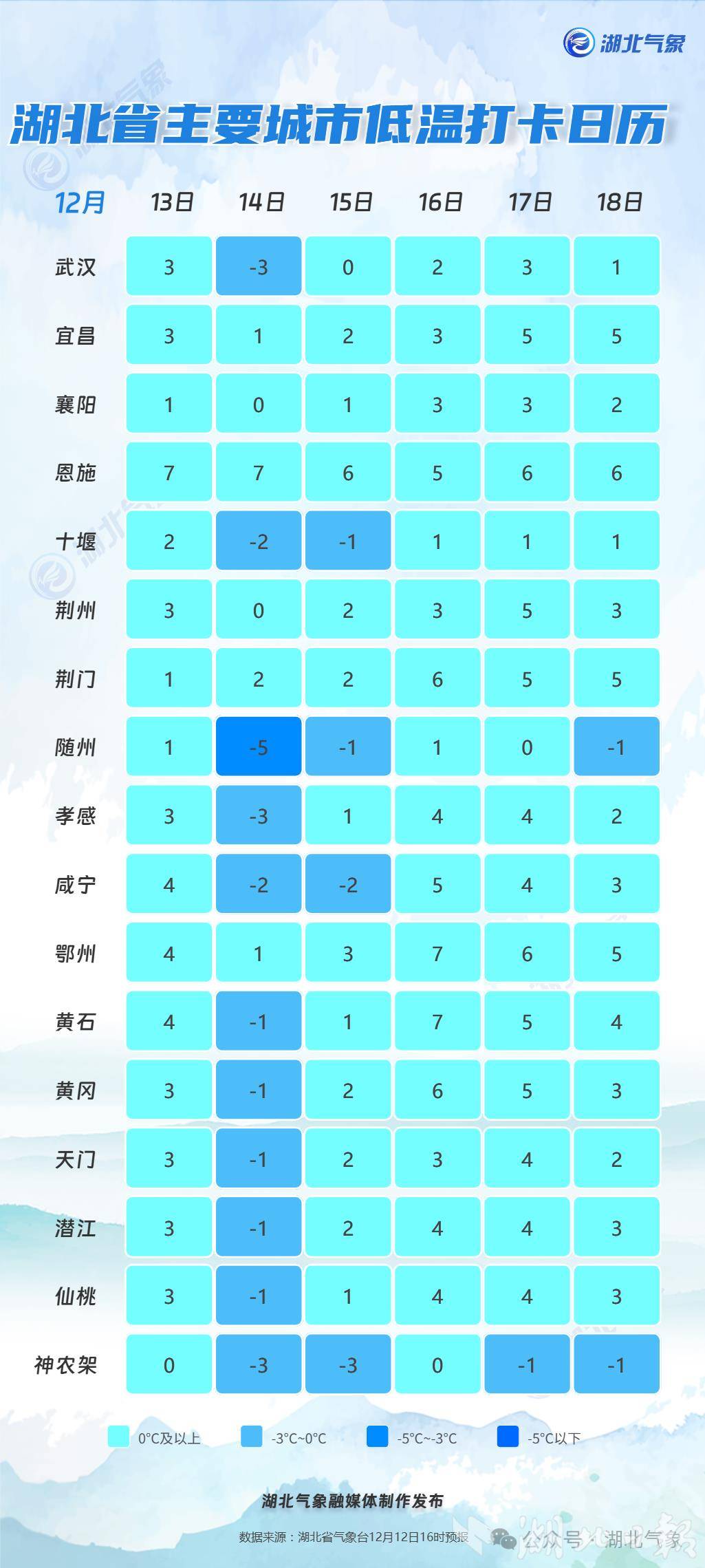 大风也是本轮寒潮的“主力”,12日中东部地区有5到6级偏北阵风,79个乡镇有7到9级阵风。预计12日晚鄂西北、江汉平原北部、鄂东北北部有小雨转雨夹雪或小雪,山区局地中雪,其他地区有小雨飘洒,局地中雨。13日起全省转为多云到晴天,白天仅鄂西南、鄂东南地区有零星小雨,山区有雨夹雪或雪。预计双休日大部地区最高气温仅10℃出头,多地低温将跌至冰点,未来三天最低气温将逐日下降,14日早晨达到最低,北部地区仅-5至-2℃,南部-2至3℃。