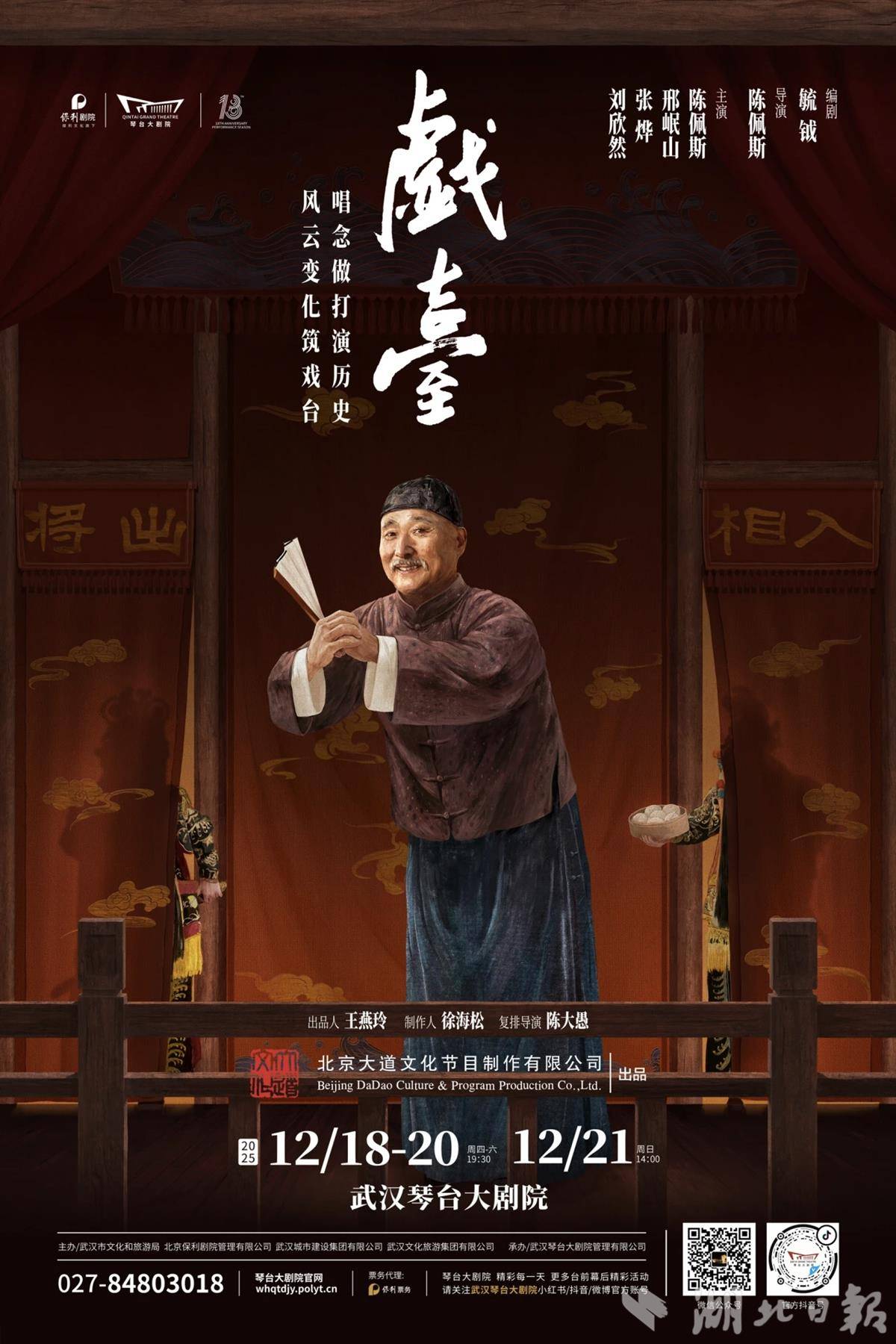 湖北日报讯(记者农新瑜、通讯员周媛媛)从武汉琴台大剧院获悉,12月18日至21日(下周四至周日),陈佩斯创作并主演的经典话剧《戏台》将在琴台大剧院连演四场。该剧由陈佩斯与编剧毓钺于2015年合作创作,迄今已在全国巡演7年,累计演出超360场,覆盖60座城市,吸引近40万人次观看,并获得了豆瓣9.0、大麦9.5的高评分。这也是该剧诞生10年后,陈佩斯再度领衔登台主演,备受观众期待。
